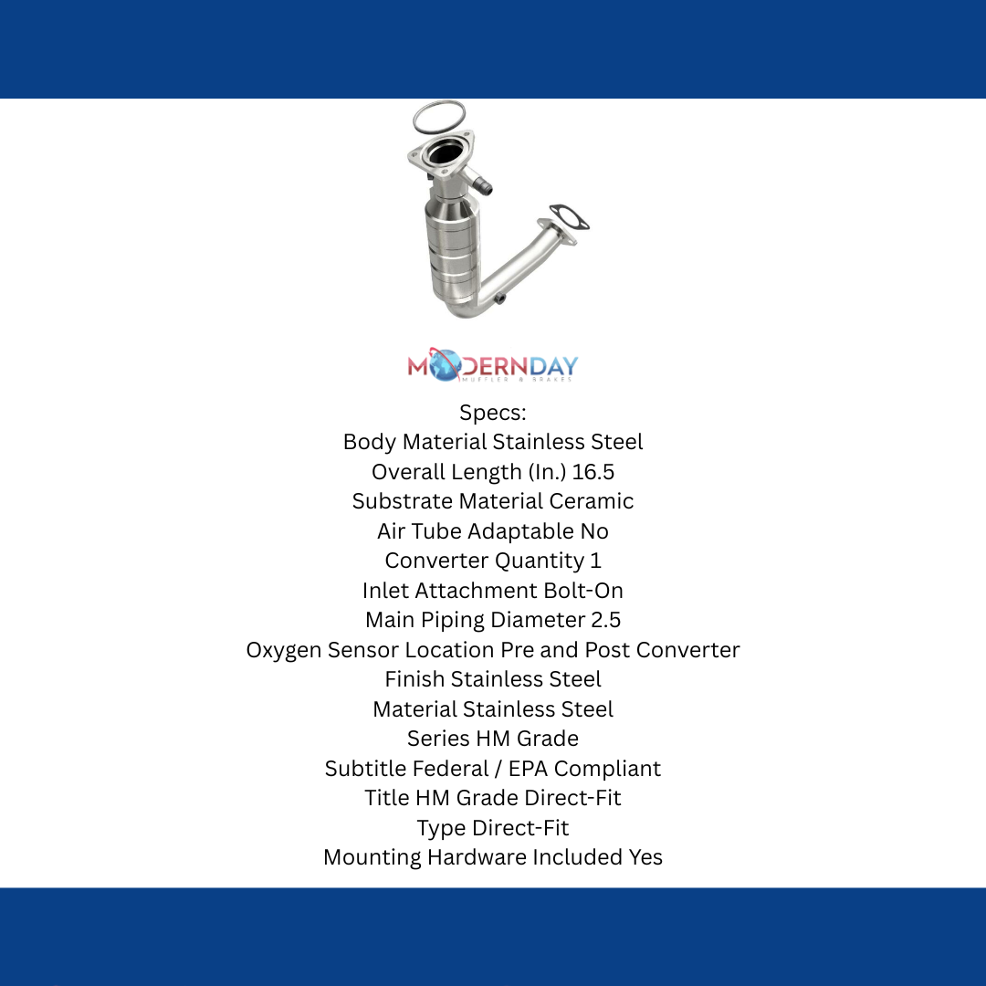 MagnaFlow HM Grade Federal/EPA Compliant Direct-Fit Catalytic Converter 25201 helps keep the check engine light off. DIY installation is easy with the proper tools (no cutting or welding required). With features including mandrel-bent tubing to eliminate flow restrictions and stainless steel construction to resist corrosion, you can have confidence in the quality of this catalytic converter. Using state-of-the-art 3D scanning systems in the design process, the MagnaFlow metrology department ensures this new part to fit and function like the original equipment. This direct-fit catalytic converter is designed specifically for the 2000-2004 Ford Focus. Avoid potential exhaust leaks by using the included gaskets to get a proper seal.