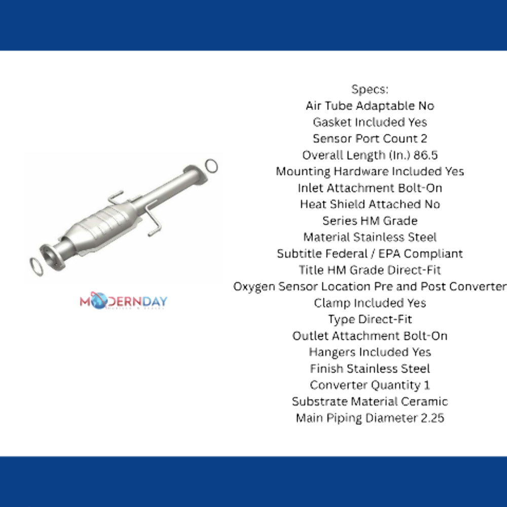 Keep the check engine light off with MagnaFlow HM Grade Federal/EPA Compliant Direct-Fit Catalytic Converter 24064. With features including free-flowing mandrel-bent tubing and highly corrosion resistant, stainless steel construction, easily install this spun body converter yourself using the proper tools, no cutting or welding required. MagnaFlow's state-of-the-art metrology department uses the latest 3D scanning systems during research and development, so you can be confident that your new part will fit and function like the original equipment. By replicating the OE spun body design, the single laser fusion weld greatly reduces the possibility of a leak, and our compact, low-mass design also allows for greater thermal efficiency. This direct-fit catalytic converter is designed specifically for the 2000-2005 Toyota Celica and interchanges with OE parts 17410-22070 and 17410-22380. The included gaskets & hardware reduce the possibility of a leaking seal while avoiding the need to reuse corroded factory parts for installation.