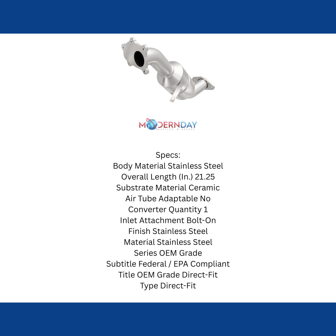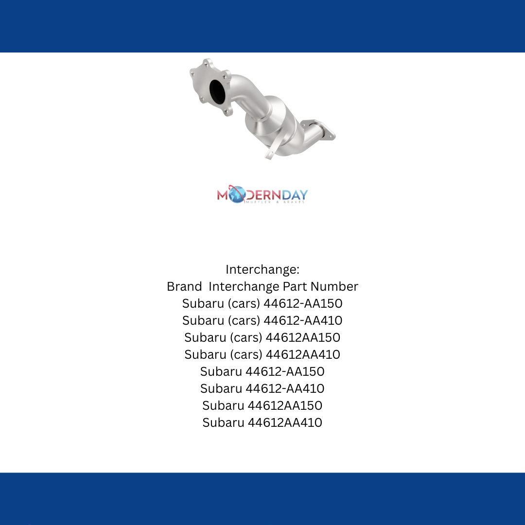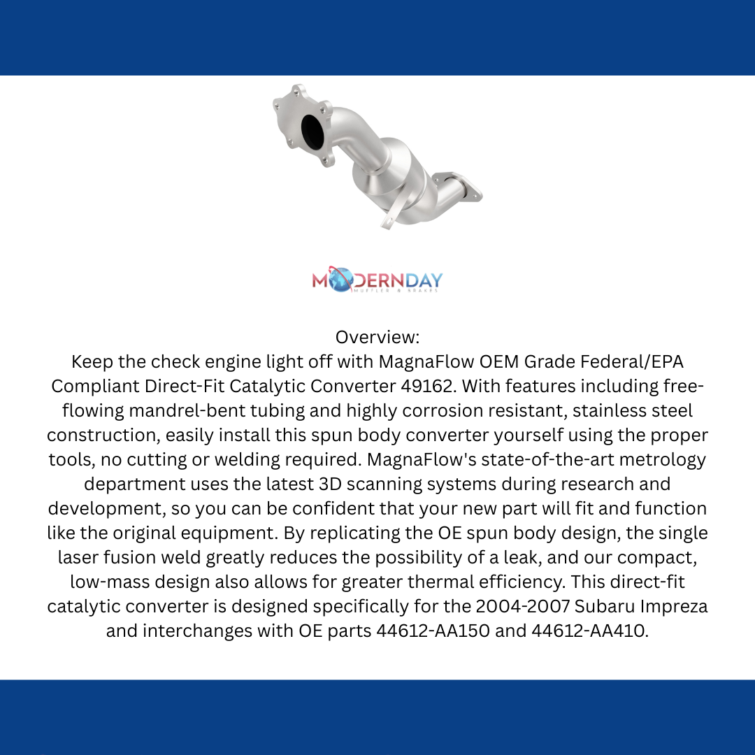 Keep the check engine light off with MagnaFlow OEM Grade Federal/EPA Compliant Direct-Fit Catalytic Converter 49162. With features including free-flowing mandrel-bent tubing and highly corrosion resistant, stainless steel construction, easily install this spun body converter yourself using the proper tools, no cutting or welding required. MagnaFlow's state-of-the-art metrology department uses the latest 3D scanning systems during research and development, so you can be confident that your new part will fit and function like the original equipment. By replicating the OE spun body design, the single laser fusion weld greatly reduces the possibility of a leak, and our compact, low-mass design also allows for greater thermal efficiency. This direct-fit catalytic converter is designed specifically for the 2004-2007 Subaru Impreza and interchanges with OE parts 44612-AA150 and 44612-AA410.