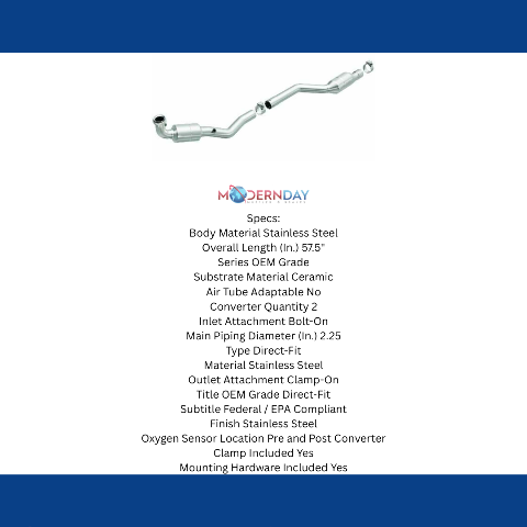 Keep the check engine light off with MagnaFlow OEM Grade Federal/EPA Compliant Direct-Fit Catalytic Converter 51419. With features including free-flowing mandrel-bent tubing and highly corrosion resistant stainless steel construction, easily install this spun body converter yourself using the proper tools, no cutting or welding required. MagnaFlow's state-of-the-art metrology department uses the latest 3D scanning systems during research and development, so you can be confident that your new part will fit and function like the original equipment. By replicating the OE spun body design, the single laser fusion weld greatly reduces the possibility of a leak, and our compact, low-mass design also allows for greater thermal efficiency. This direct-fit catalytic converter is designed specifically for the 2003-2006 Mercedes-Benz SL500 and interchanges with OE parts 230 490 37 19 80 and 230 490 13 19, among others. Hardware is included to eliminate the hassle of working with corroded factory parts. This replacement part is designed to meet or exceed Federal emissions requirements set forth by the EPA, complying with legal standards for OBDII Federally registered vehicles with Federal/EPA Emission systems.