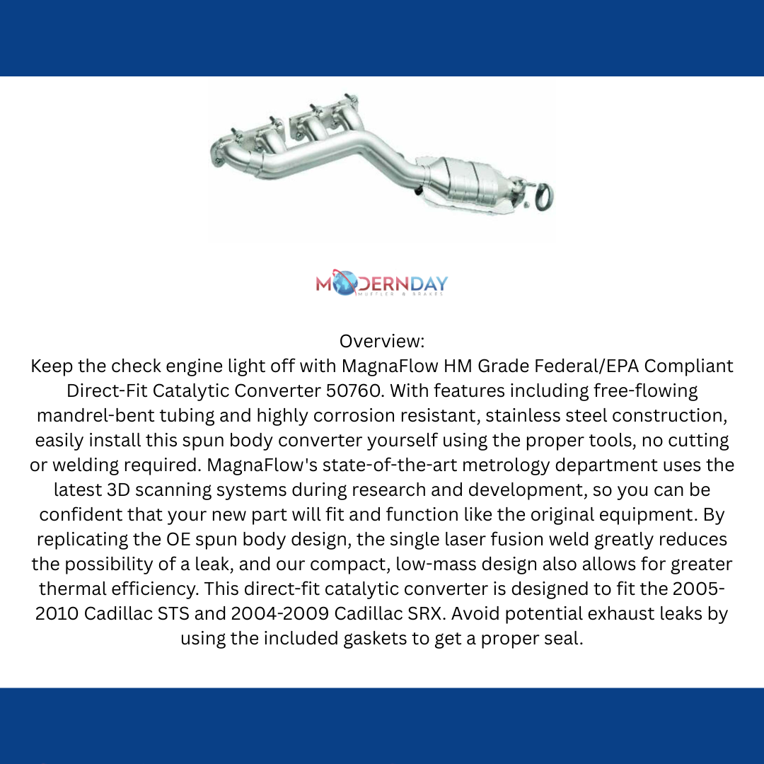 Keep the check engine light off with MagnaFlow HM Grade Federal/EPA Compliant Direct-Fit Catalytic Converter 50760. With features including free-flowing mandrel-bent tubing and highly corrosion resistant, stainless steel construction, easily install this spun body converter yourself using the proper tools, no cutting or welding required. MagnaFlow's state-of-the-art metrology department uses the latest 3D scanning systems during research and development, so you can be confident that your new part will fit and function like the original equipment. By replicating the OE spun body design, the single laser fusion weld greatly reduces the possibility of a leak, and our compact, low-mass design also allows for greater thermal efficiency. This direct-fit catalytic converter is designed to fit the 2005-2010 Cadillac STS and 2004-2009 Cadillac SRX. Avoid potential exhaust leaks by using the included gaskets to get a proper seal.