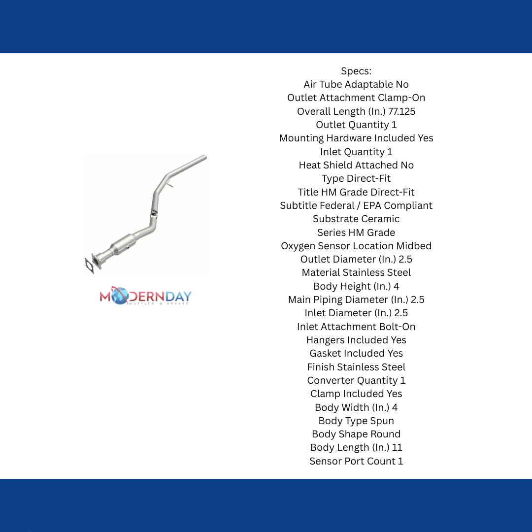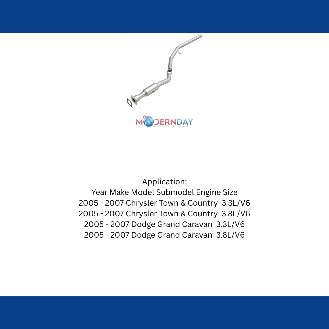 Keep the check engine light off with MagnaFlow HM Grade Federal/EPA Compliant Direct-Fit Catalytic Converter 93202. With features including free-flowing mandrel-bent tubing and highly corrosion resistant, stainless steel construction, easily install this spun body converter yourself using the proper tools, no cutting or welding required. MagnaFlow's state-of-the-art metrology department uses the latest 3D scanning systems during research and development, so you can be confident that your new part will fit and function like the original equipment. By replicating the OE spun body design, the single laser fusion weld greatly reduces the possibility of a leak, and our compact, low-mass design also allows for greater thermal efficiency. Designed to fit the 2005-2007 Dodge Grand Caravan and 2005-2007 Chrysler Town & Country, this direct-fit catalytic converter also interchanges with OE parts 7B0 254 502 and 7B0 254 502 A. The included gaskets & hardware reduce the possibility of a leaking seal while avoiding the need to reuse corroded factory parts for installation.