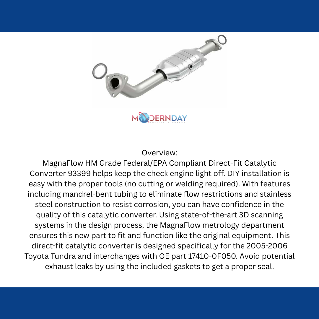 MagnaFlow HM Grade Federal/EPA Compliant Direct-Fit Catalytic Converter 93399 helps keep the check engine light off. DIY installation is easy with the proper tools (no cutting or welding required). With features including mandrel-bent tubing to eliminate flow restrictions and stainless steel construction to resist corrosion, you can have confidence in the quality of this catalytic converter. Using state-of-the-art 3D scanning systems in the design process, the MagnaFlow metrology department ensures this new part to fit and function like the original equipment. This direct-fit catalytic converter is designed specifically for the 2005-2006 Toyota Tundra and interchanges with OE part 17410-0F050. Avoid potential exhaust leaks by using the included gaskets to get a proper seal.