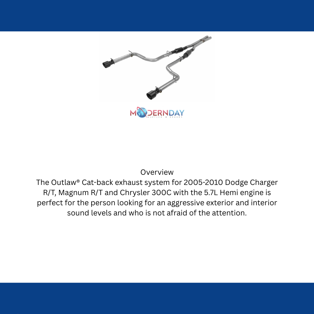 The Outlaw® Cat-back exhaust system for 2005-2010 Dodge Charger R/T, Magnum R/T and Chrysler 300C with the 5.7L Hemi engine is perfect for the person looking for an aggressive exterior and interior sound levels and who is not afraid of the attention.