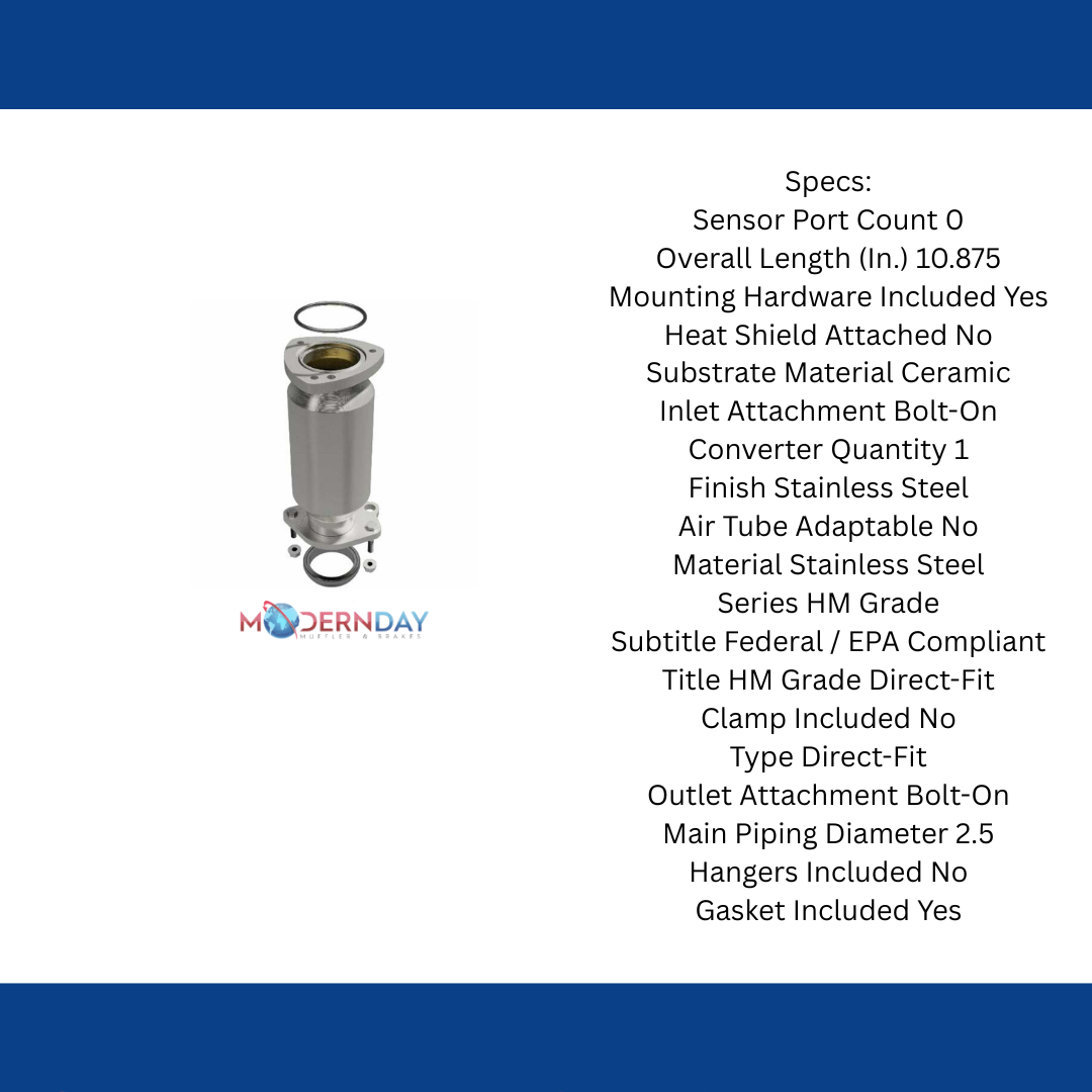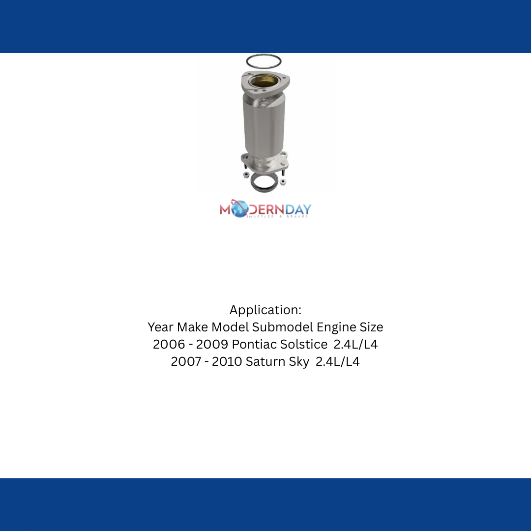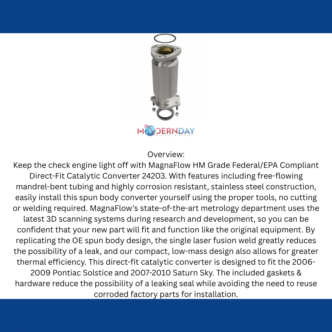 Keep the check engine light off with MagnaFlow HM Grade Federal/EPA Compliant Direct-Fit Catalytic Converter 24203. With features including free-flowing mandrel-bent tubing and highly corrosion resistant, stainless steel construction, easily install this spun body converter yourself using the proper tools, no cutting or welding required. MagnaFlow's state-of-the-art metrology department uses the latest 3D scanning systems during research and development, so you can be confident that your new part will fit and function like the original equipment. By replicating the OE spun body design, the single laser fusion weld greatly reduces the possibility of a leak, and our compact, low-mass design also allows for greater thermal efficiency. This direct-fit catalytic converter is designed to fit the 2006-2009 Pontiac Solstice and 2007-2010 Saturn Sky. The included gaskets & hardware reduce the possibility of a leaking seal while avoiding the need to reuse corroded factory parts for installation.