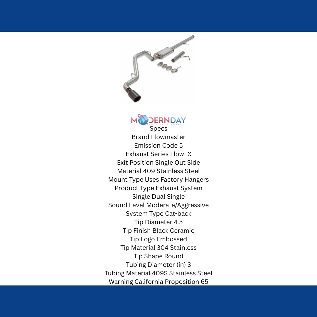 Our new Flowmaster® FlowFX® cat-back exhaust system for the 2009-2013 GM Silverado/Sierra with 4.8L and 5.3L engines is manufactured using 409S stainless steel for years of trouble free service. System features include a 3.00-inch inlet pipe leadi