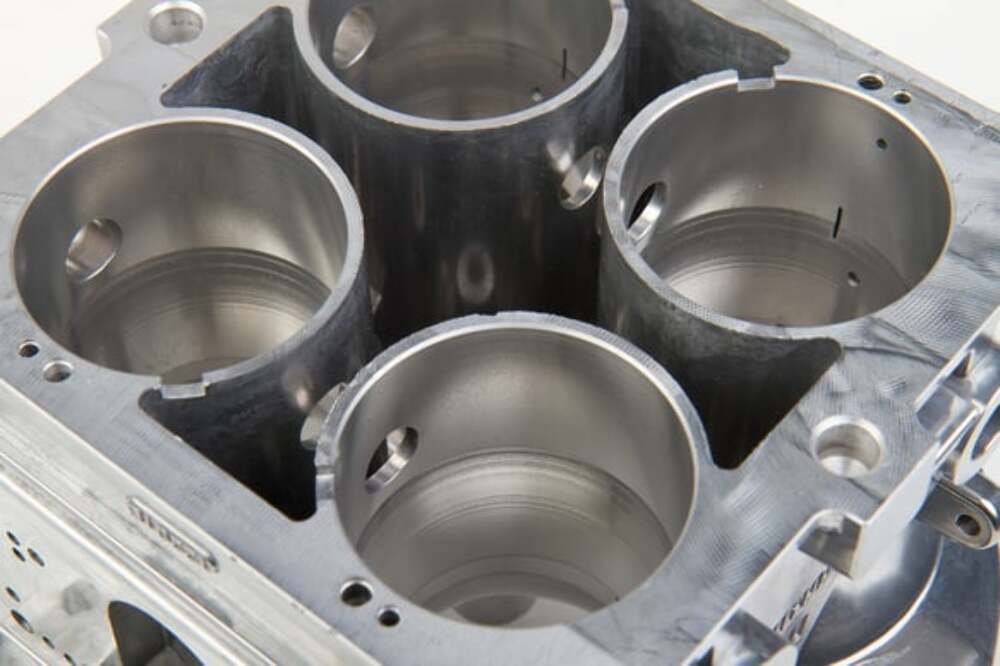- Shiny with red anodized billet aluminum metering block and booster inserts