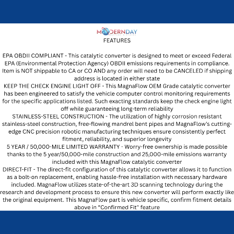 - EPA OBDII COMPLIANT - This catalytic converter is designed to meet or exceed Federal EPA (Environmental Protection Agency) OBDII emissions requirements in compliance. Item is NOT shippable to CA or CO AND any order will need to be CANCELED if shipping address is located in either state