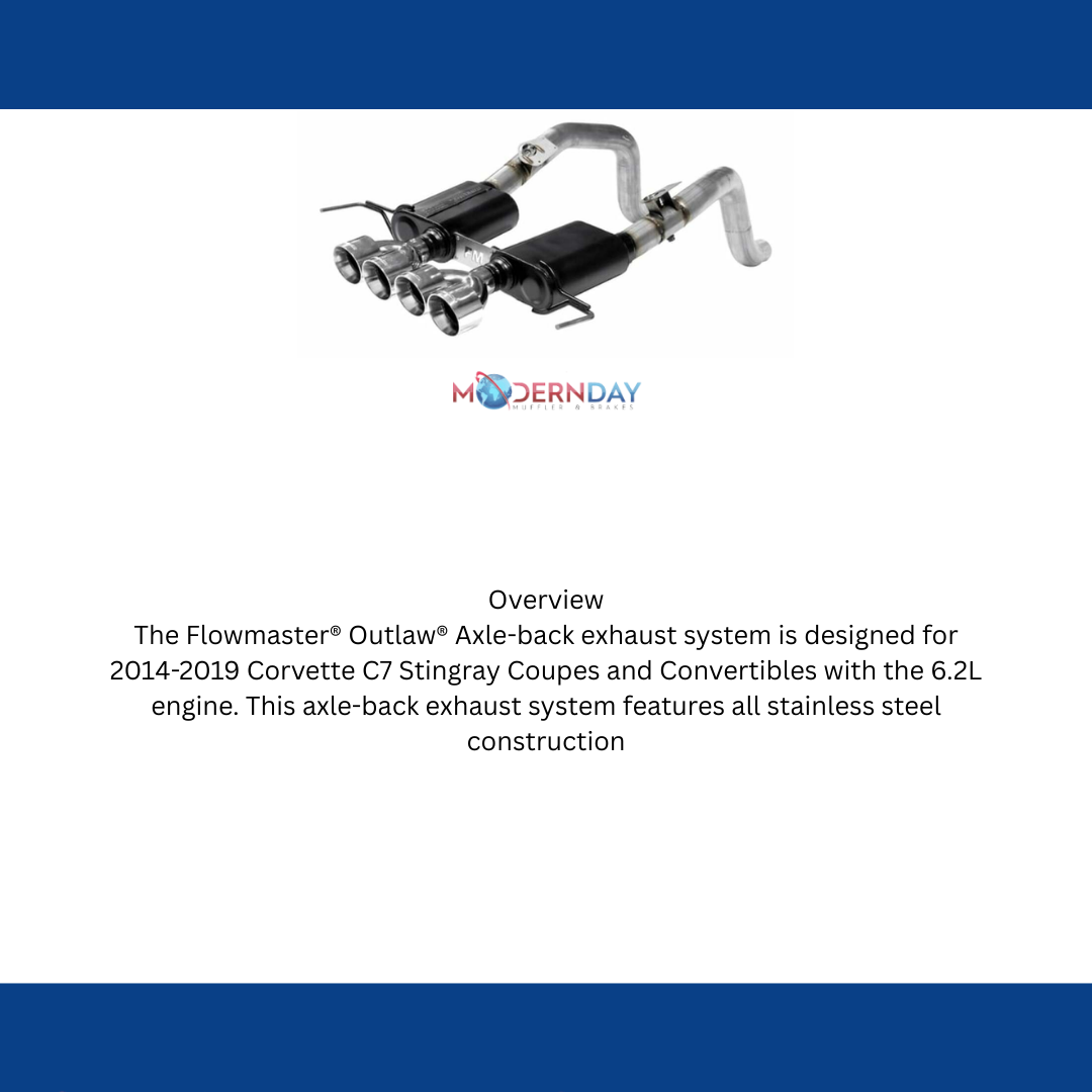 The Flowmaster® Outlaw® Axle-back exhaust system is designed for 2014-2019 Corvette C7 Stingray Coupes and Convertibles with the 6.2L engine. This axle-back exhaust system features all stainless steel construction with 3.00-inch mandrel-bent tubin
