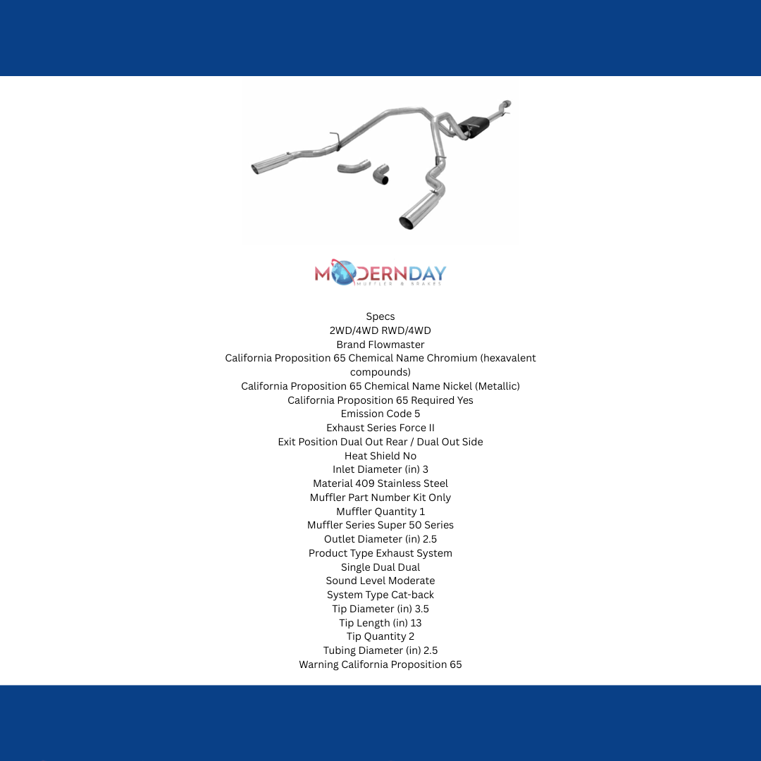 This is the Force II® cat-back exhaust system for the 2014-2019* (*Classic body) Chevrolet Silverado/GMC Sierra 1500 trucks with 4.3L or 5.3L engines. This exhaust system is perfect for the person looking for a moderate sound level outside the vehicle