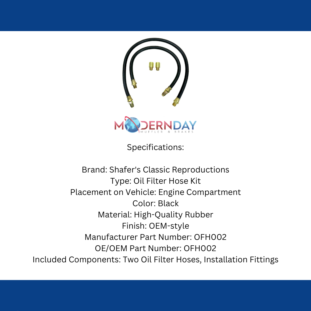 The OFH002 is an oil filter hose kit designed specifically for 1949-1954 Chevrolet Full-Size models equipped with 6-cylinder engines. This kit includes two hoses that connect the engine to the oil filter canister, along with the necessary fittings for installation. Manufactured to meet or exceed original equipment specifications, it ensures a precise fit and reliable performance.