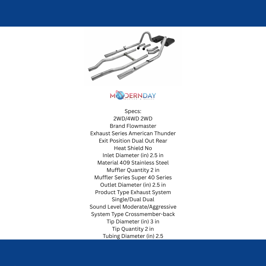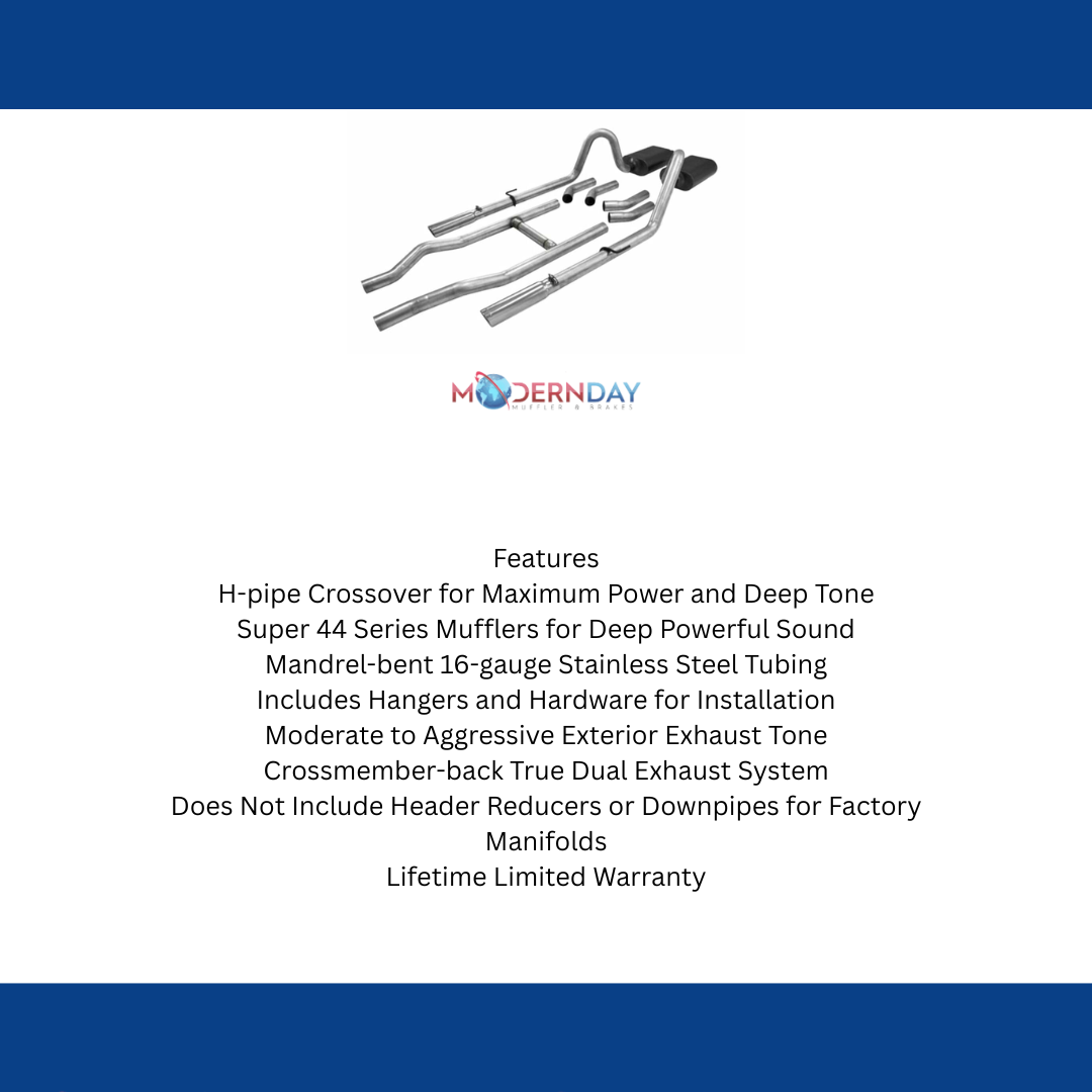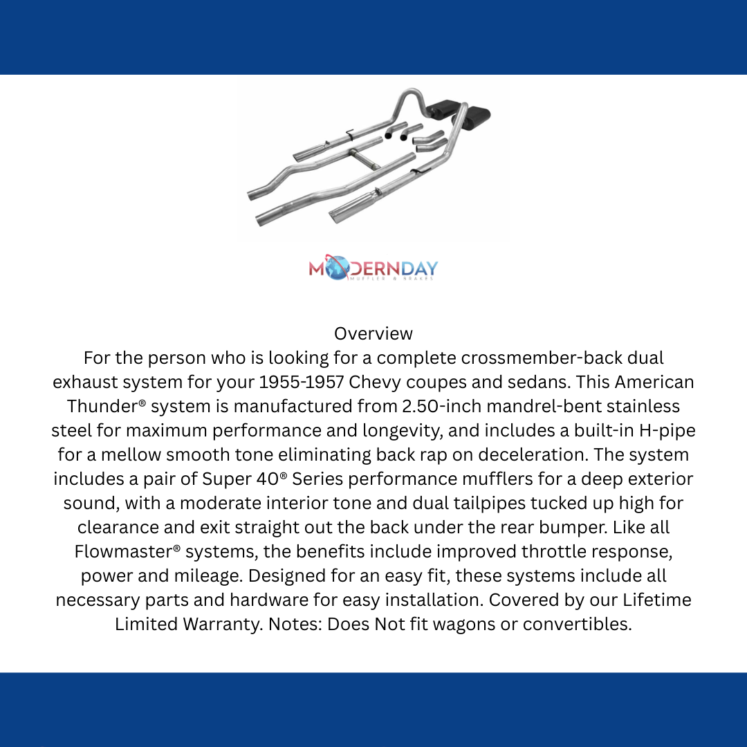 For the person who is looking for a complete crossmember-back dual exhaust system for your 1955-1957 Chevy coupes and sedans. This American Thunder® system is manufactured from 2.50-inch mandrel-bent stainless steel for maximum performance and longevity, and includes a built-in H-pipe for a mellow smooth tone eliminating back rap on deceleration. The system includes a pair of Super 40® Series performance mufflers for a deep exterior sound, with a moderate interior tone and dual tailpipes tucked up high for clearance and exit straight out the back under the rear bumper. Like all Flowmaster® systems, the benefits include improved throttle response, power and mileage. Designed for an easy fit, these systems include all necessary parts and hardware for easy installation. Covered by our Lifetime Limited Warranty. Notes: Does Not fit wagons or convertibles.