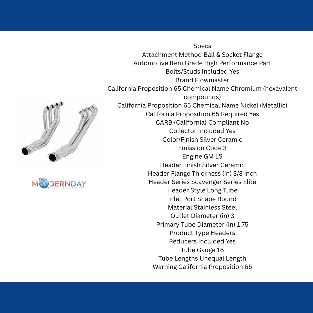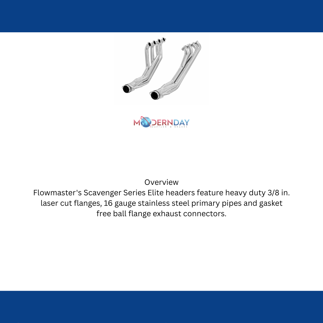 Flowmaster's Scavenger Series Elite headers feature heavy duty 3/8 in. laser cut flanges, 16 gauge stainless steel primary pipes and gasket free ball flange exhaust connectors.