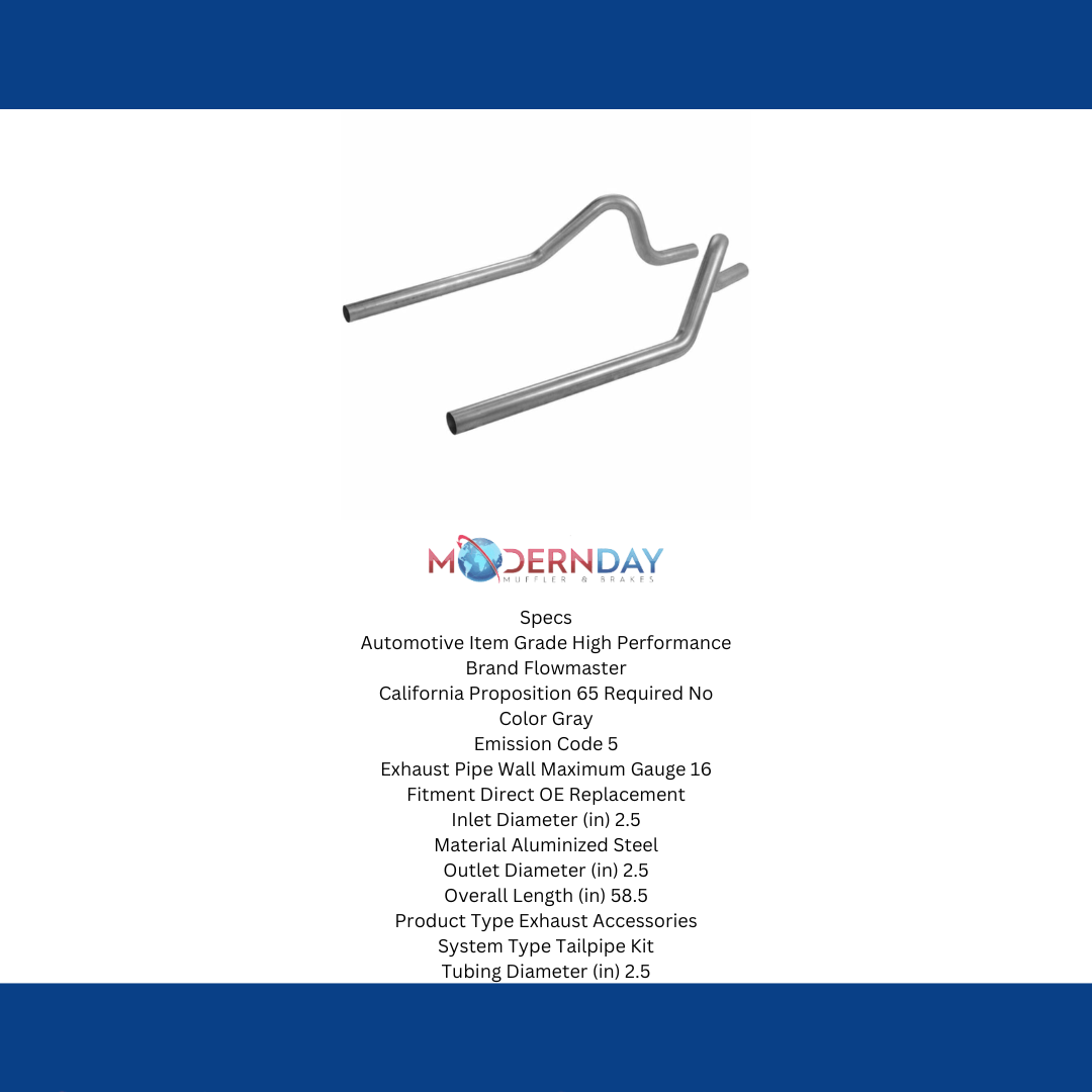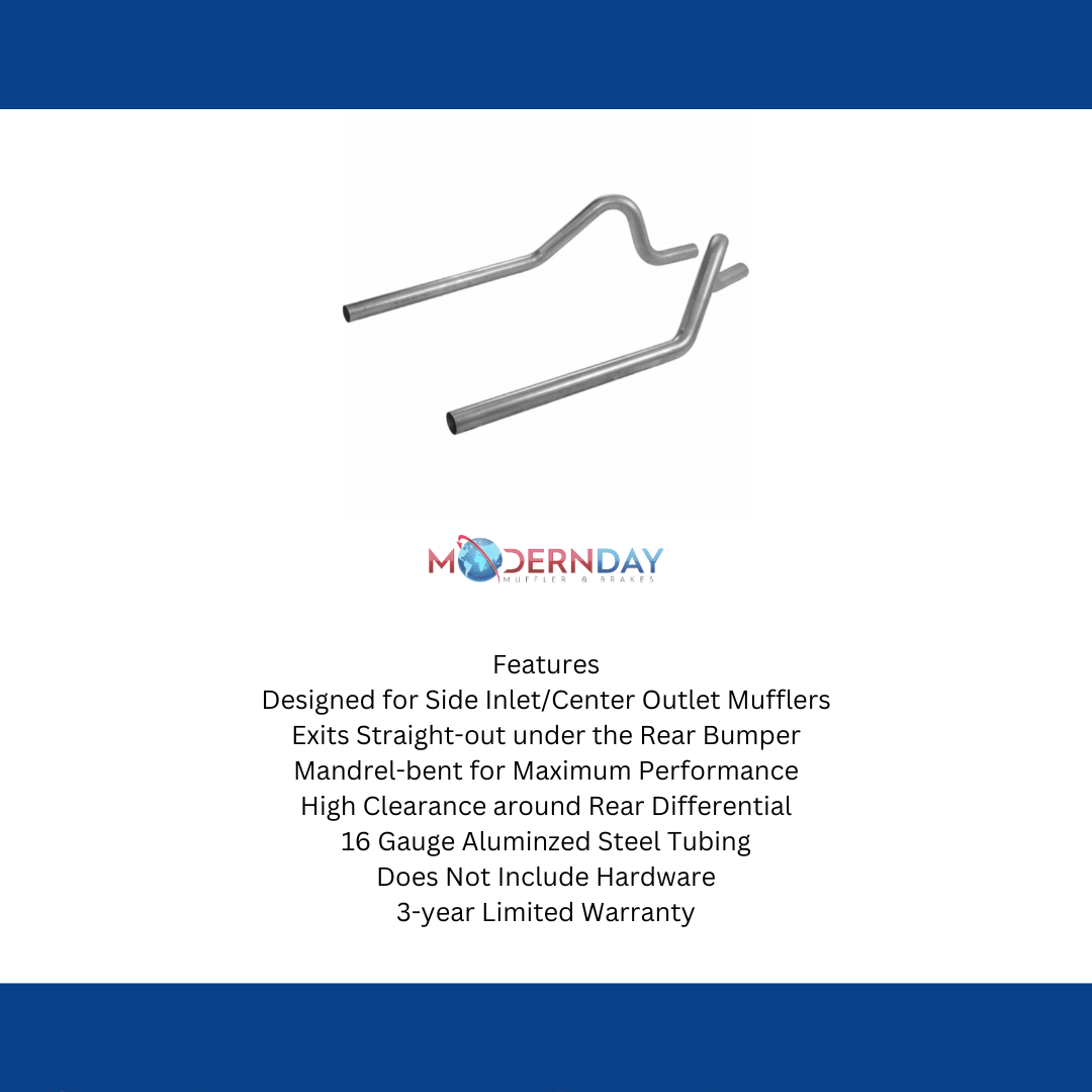These Builder Series tailpipes are constructed from 2.50-inch mandrel-bent 16-gauge aluminized steel tubing for maximum flow, tuck up high in the chassis for good clearance and exit straight-out the back under the rear bumper. Designed to be used with Side Inlet/Center Outlet mufflers such as part# 942546 (Super 44 Series) or 942551 (50 Series) mufflers. Covered by our 3-year Limited Warranty. Note: Not designed to fit in factory bumper cutouts. Some fitment may be necessary. Does Not include installation hardware or exhaust tips. Does not fit cars with staggered shocks.