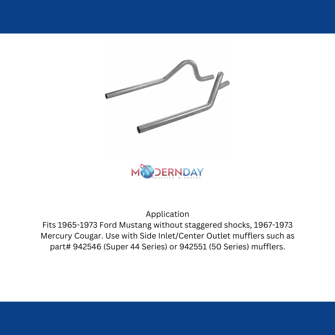 - Fits 1965-1973 Ford Mustang without staggered shocks, 1967-1973 Mercury Cougar. Use with Side Inlet/Center Outlet mufflers such as part# 942546 (Super 44 Series) or 942551 (50 Series) mufflers.