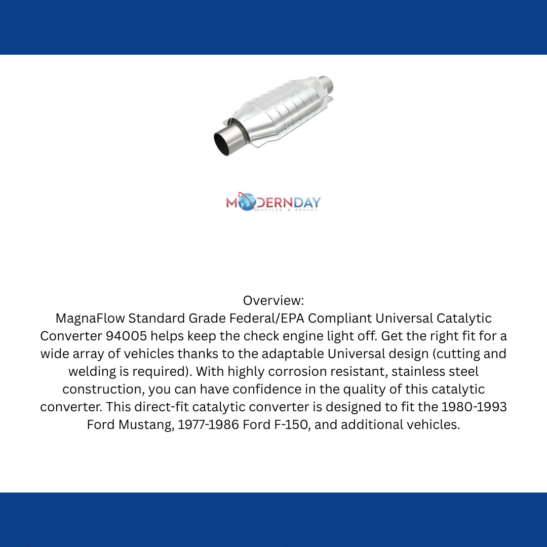 MagnaFlow Standard Grade Federal/EPA Compliant Universal Catalytic Converter 94005 helps keep the check engine light off. Get the right fit for a wide array of vehicles thanks to the adaptable Universal design (cutting and welding is required). With highly corrosion resistant, stainless steel construction, you can have confidence in the quality of this catalytic converter. This direct-fit catalytic converter is designed to fit the 1980-1993 Ford Mustang, 1977-1986 Ford F-150, and additional vehicles.