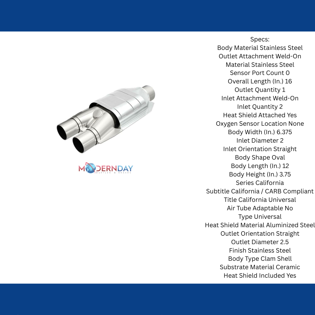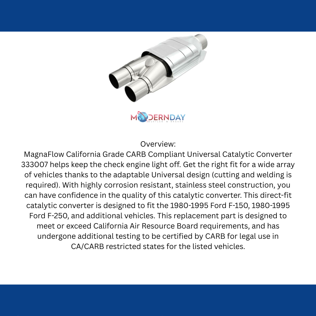 MagnaFlow California Grade CARB Compliant Universal Catalytic Converter 333007 helps keep the check engine light off. Get the right fit for a wide array of vehicles thanks to the adaptable Universal design (cutting and welding is required). With highly corrosion resistant, stainless steel construction, you can have confidence in the quality of this catalytic converter. This direct-fit catalytic converter is designed to fit the 1980-1995 Ford F-150, 1980-1995 Ford F-250, and additional vehicles. This replacement part is designed to meet or exceed California Air Resource Board requirements, and has undergone additional testing to be certified by CARB for legal use in CA/CARB restricted states for the listed vehicles.