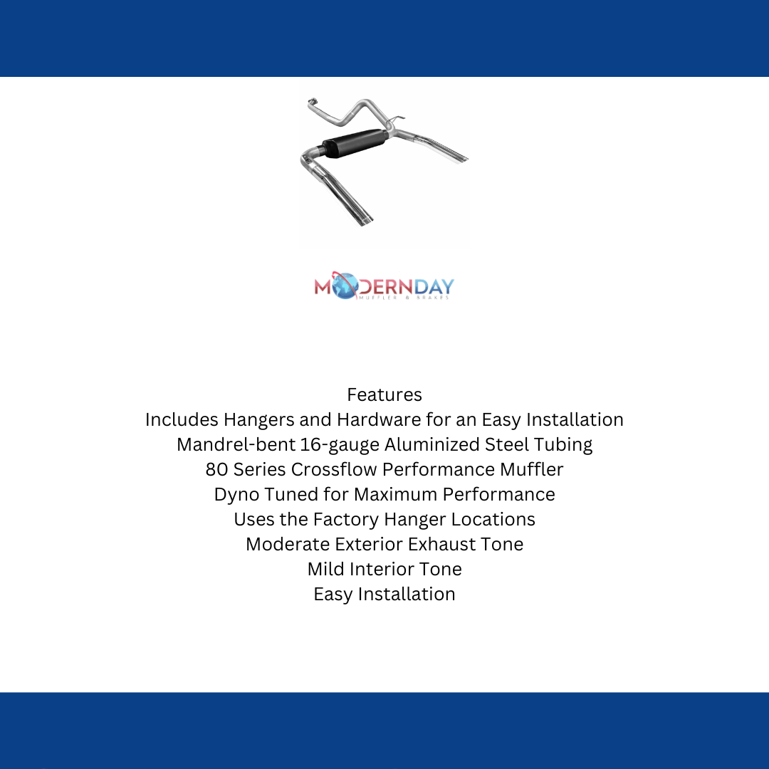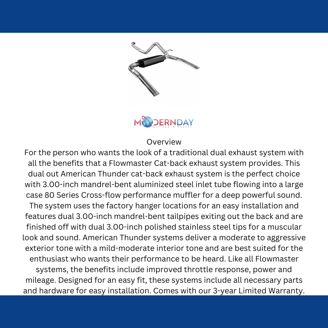 For the person who wants the look of a traditional dual exhaust system with all the benefits that a Flowmaster Cat-back exhaust system provides. This dual out American Thunder cat-back exhaust system is the perfect choice with 3.00-inch mandrel-bent aluminized steel inlet tube flowing into a large case 80 Series Cross-flow performance muffler for a deep powerful sound. The system uses the factory hanger locations for an easy installation and features dual 3.00-inch mandrel-bent tailpipes exiting out the back and are finished off with dual 3.00-inch polished stainless steel tips for a muscular look and sound. American Thunder systems deliver a moderate to aggressive exterior tone with a mild-moderate interior tone and are best suited for the enthusiast who wants their performance to be heard. Like all Flowmaster systems, the benefits include improved throttle response, power and mileage. Designed for an easy fit, these systems include all necessary parts and hardware for easy installation. Comes with our 3-year Limited Warranty.