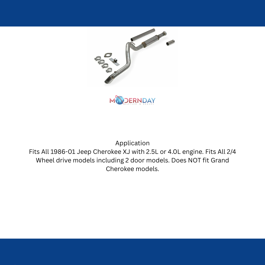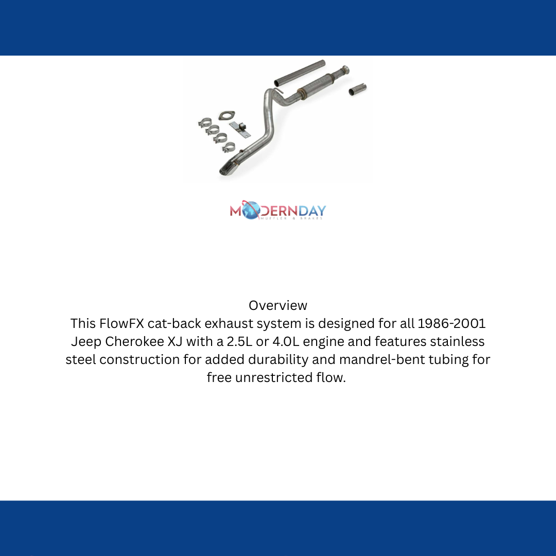 This FlowFX cat-back exhaust system is designed for all 1986-2001 Jeep Cherokee XJ with a 2.5L or 4.0L engine and features stainless steel construction for added durability and mandrel-bent tubing for free unrestricted flow. The "straight-through" FlowFX