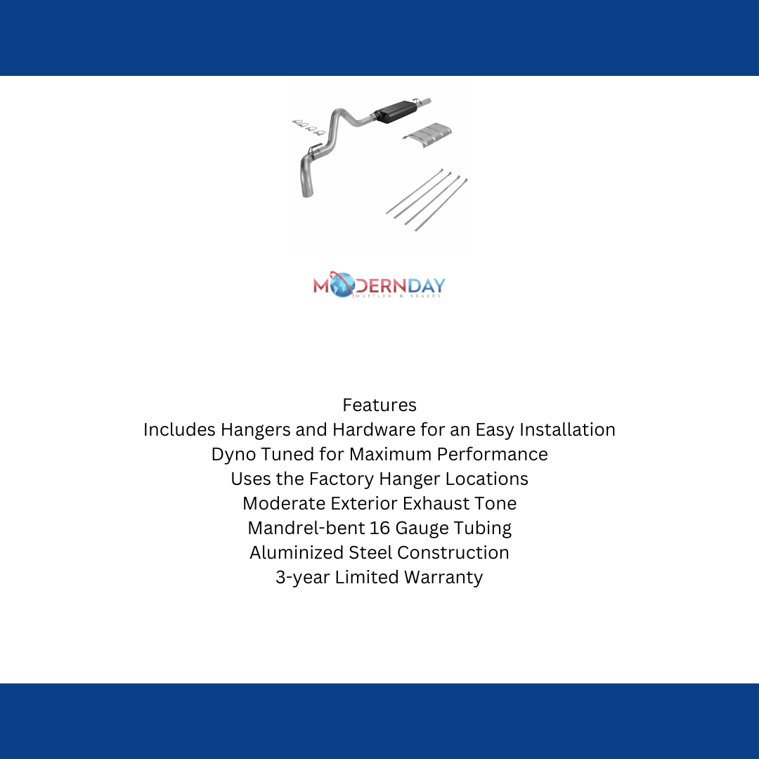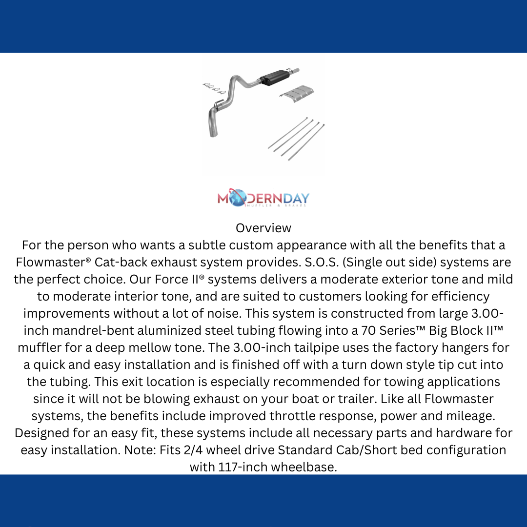 For the person who wants a subtle custom appearance with all the benefits that a Flowmaster® Cat-back exhaust system provides. S.O.S. (Single out side) systems are the perfect choice. Our Force II® systems delivers a moderate exterior tone and mild to moderate interior tone, and are suited to customers looking for efficiency improvements without a lot of noise. This system is constructed from large 3.00-inch mandrel-bent aluminized steel tubing flowing into a 70 Series™ Big Block II™ muffler for a deep mellow tone. The 3.00-inch tailpipe uses the factory hangers for a quick and easy installation and is finished off with a turn down style tip cut into the tubing. This exit location is especially recommended for towing applications since it will not be blowing exhaust on your boat or trailer. Like all Flowmaster systems, the benefits include improved throttle response, power and mileage. Designed for an easy fit, these systems include all necessary parts and hardware for easy installation. Note: Fits 2/4 wheel drive Standard Cab/Short bed configuration with 117-inch wheelbase.