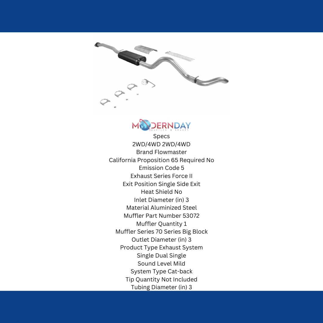 This Flowmaster Force II® cat-back exhaust system is custom designed for 1993-1995 Chevrolet Tahoe/GMC Yukon with 5.7L engine and is perfect for the person looking for a mild to moderate sound level inside and outside of the truck, with all of the performance benefits that you would expect from Flowmaster®. This bolt-on emissions-legal system features a 3.00-inch mandrel-bent aluminized steel inlet pipe flowing into a 70 Series Big Block II™ muffler for a deep mellow tone. The single 3.00-inch aluminized steel mandrel-bent tailpipe is finished off with an angle cut turn down style tip behind the right rear wheel and uses the factory hanger locations. Also includes an aluminum heat shield with strap clamps to secure it to the muffler. The exhaust system is covered by our 3-year Limited Warranty and includes all necessary parts and hardware for a quick and easy installation you can do at home. Notes: Fits 2/4 wheel drive models with Extended Cab/Short bed configuration on a 141-inch wheelbase.