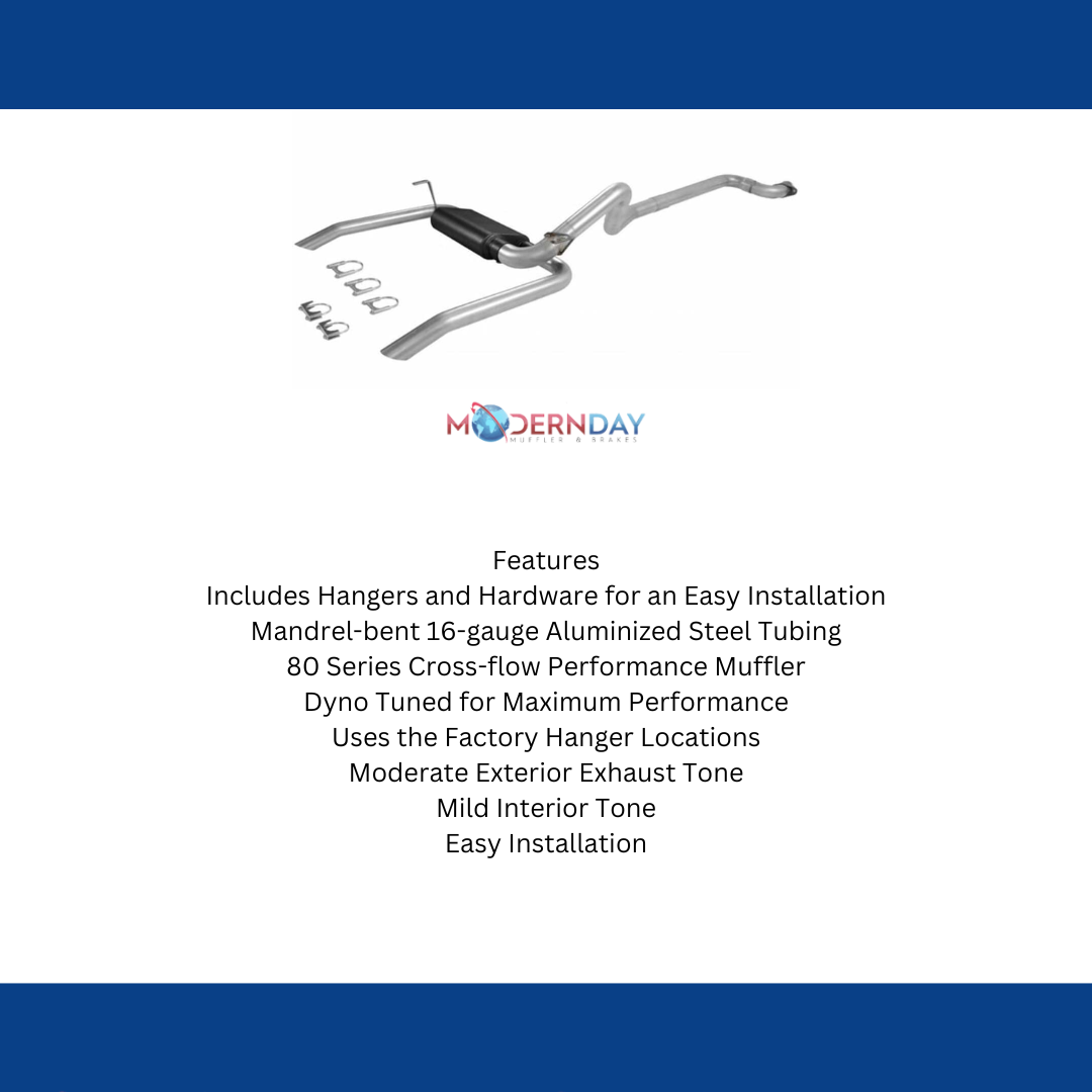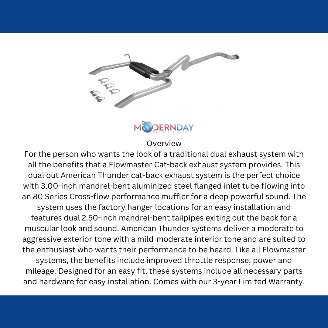 For the person who wants the look of a traditional dual exhaust system with all the benefits that a Flowmaster Cat-back exhaust system provides. This dual out American Thunder cat-back exhaust system is the perfect choice with 3.00-inch mandrel-bent aluminized steel flanged inlet tube flowing into an 80 Series Cross-flow performance muffler for a deep powerful sound. The system uses the factory hanger locations for an easy installation and features dual 2.50-inch mandrel-bent tailpipes exiting out the back for a muscular look and sound. American Thunder systems deliver a moderate to aggressive exterior tone with a mild-moderate interior tone and are suited to the enthusiast who wants their performance to be heard. Like all Flowmaster systems, the benefits include improved throttle response, power and mileage. Designed for an easy fit, these systems include all necessary parts and hardware for easy installation. Comes with our 3-year Limited Warranty.