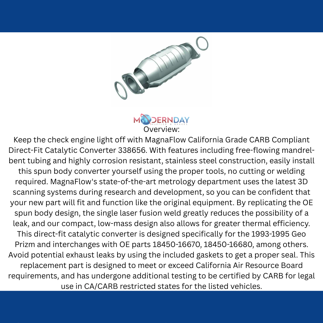 Keep the check engine light off with MagnaFlow California Grade CARB Compliant Direct-Fit Catalytic Converter 338656. With features including free-flowing mandrel-bent tubing and highly corrosion resistant, stainless steel construction, easily install this spun body converter yourself using the proper tools, no cutting or welding required. MagnaFlow's state-of-the-art metrology department uses the latest 3D scanning systems during research and development, so you can be confident that your new part will fit and function like the original equipment. By replicating the OE spun body design, the single laser fusion weld greatly reduces the possibility of a leak, and our compact, low-mass design also allows for greater thermal efficiency. This direct-fit catalytic converter is designed specifically for the 1993-1995 Geo Prizm and interchanges with OE parts 18450-16670, 18450-16680, among others. Avoid potential exhaust leaks by using the included gaskets to get a proper seal. This replacement part is designed to meet or exceed California Air Resource Board requirements, and has undergone additional testing to be certified by CARB for legal use in CA/CARB restricted states for the listed vehicles.