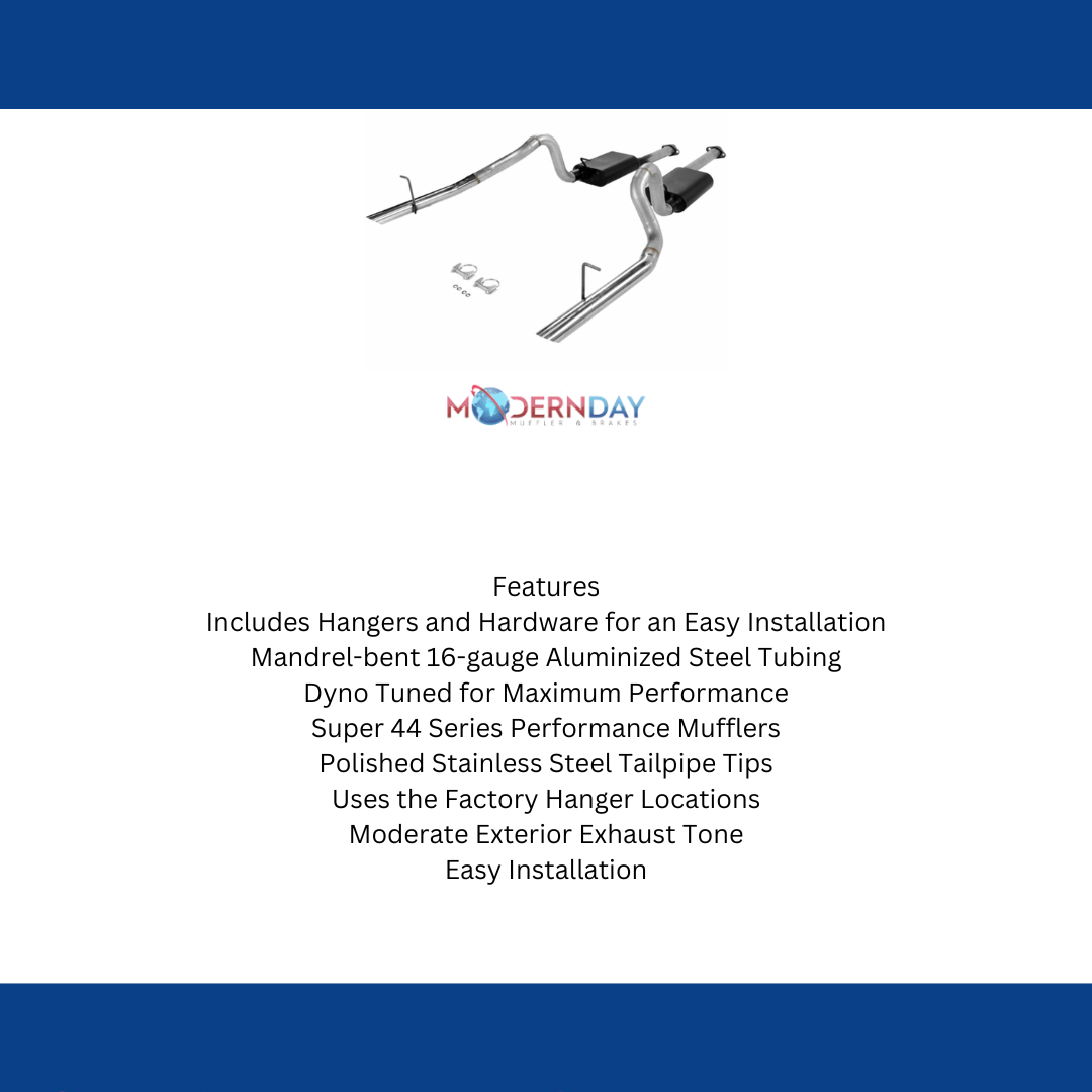 Our American Thunder® exhaust system for 1994-1997 Ford Mustang GT and Cobra models with a 4.6L or 5.0L engine is a bolt-on emissions legal system featuring free-flowing 2.50-inch aluminized steel mandrel-bent inlet pipes, aluminized steel tailpipes and uses the factory hanger locations for quick and easy installation. This Flowmaster® exhaust system comes with a pair of Super 44 Series™ performance mufflers incorporating Delta Flow® technology with a deep powerful sound. The system is finished off with a pair of long 2.50-inch polished 304 stainless steel tips for that show car look. Comes with all necessary hardware and easy to follow instructions. Note: Fits coupes and convertibles.