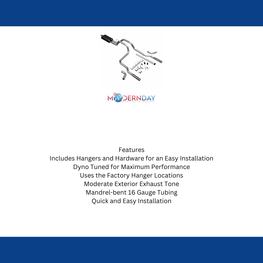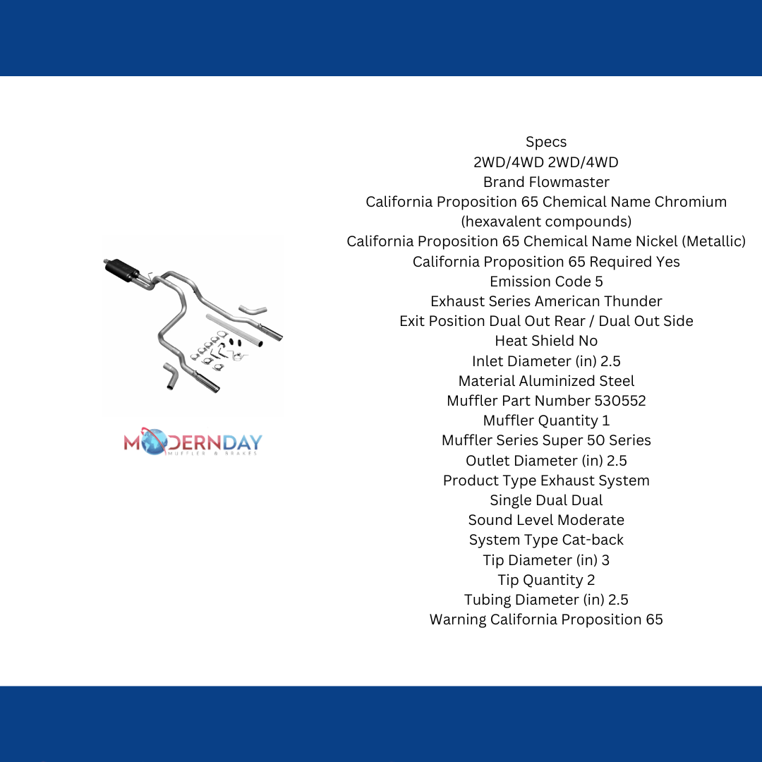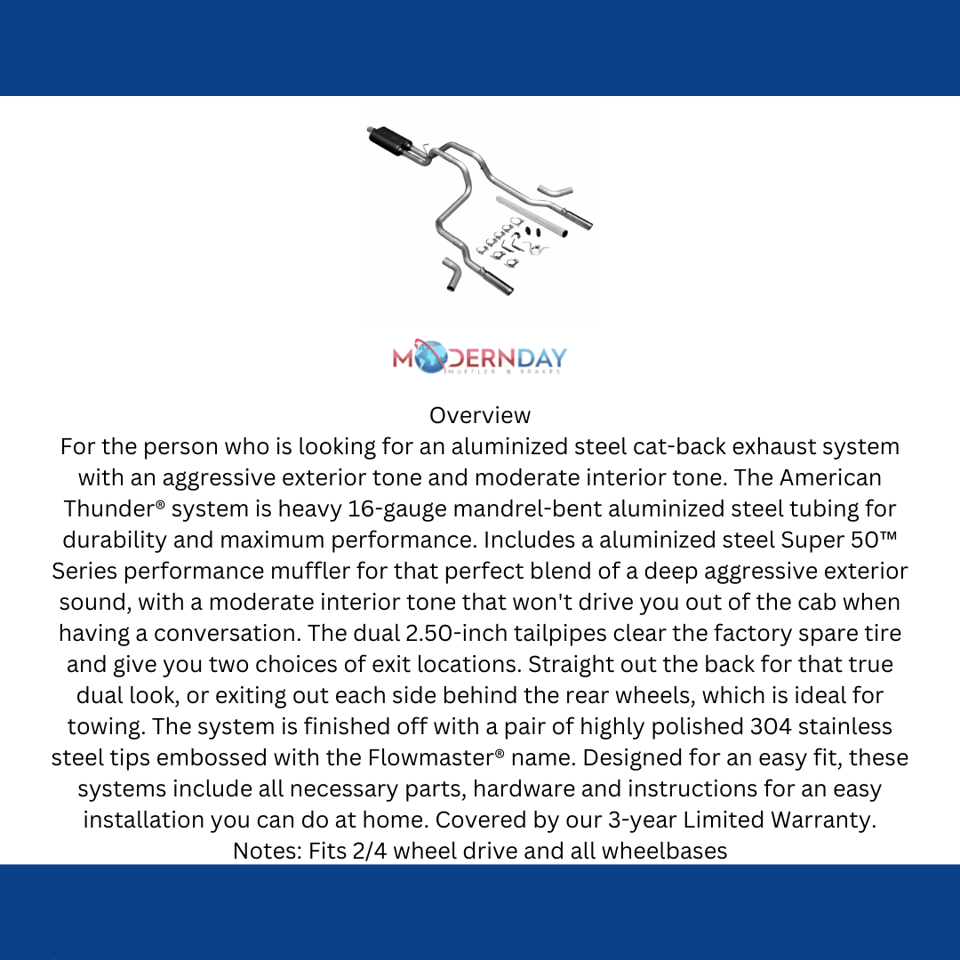 For the person who is looking for an aluminized steel cat-back exhaust system with an aggressive exterior tone and moderate interior tone. The American Thunder® system is heavy 16-gauge mandrel-bent aluminized steel tubing for durability and maximum performance. Includes a aluminized steel Super 50™ Series performance muffler for that perfect blend of a deep aggressive exterior sound, with a moderate interior tone that won't drive you out of the cab when having a conversation. The dual 2.50-inch tailpipes clear the factory spare tire and give you two choices of exit locations. Straight out the back for that true dual look, or exiting out each side behind the rear wheels, which is ideal for towing. The system is finished off with a pair of highly polished 304 stainless steel tips embossed with the Flowmaster® name. Designed for an easy fit, these systems include all necessary parts, hardware and instructions for an easy installation you can do at home. Covered by our 3-year Limited Warranty. Notes: Fits 2/4 wheel drive and all wheelbases