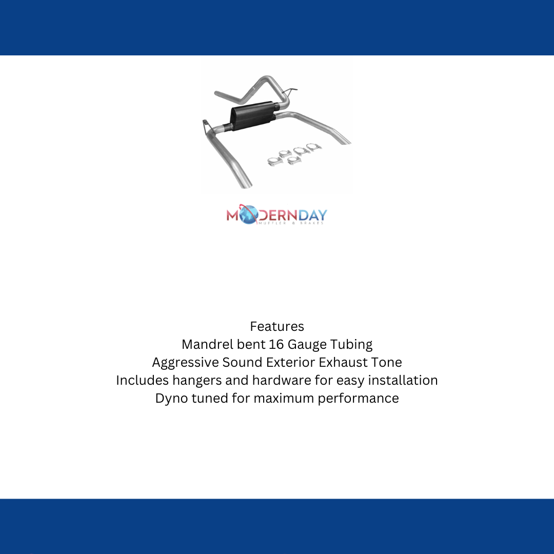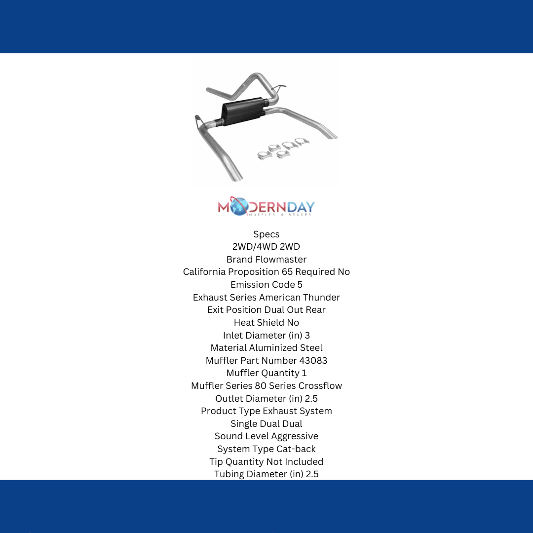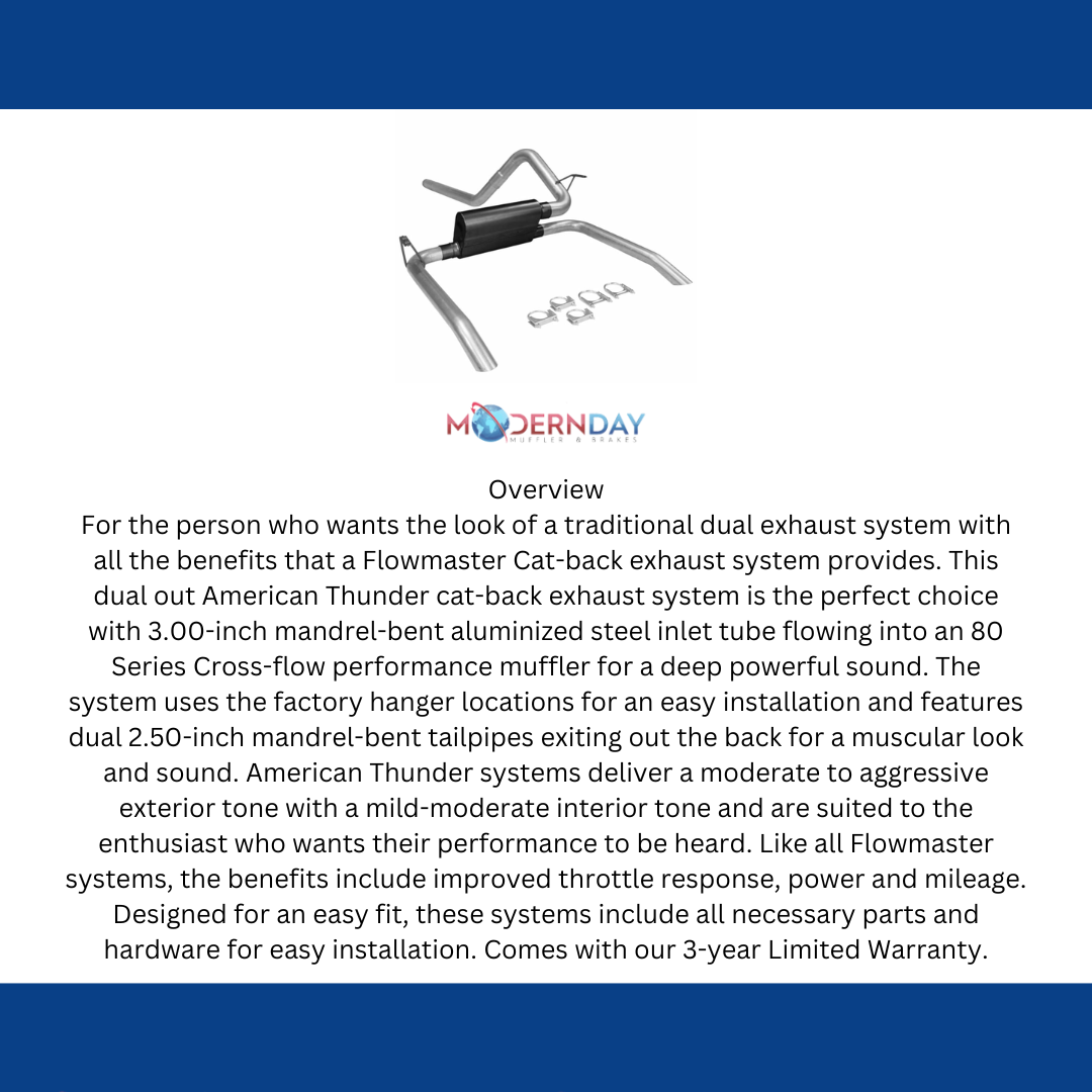 For the person who wants the look of a traditional dual exhaust system with all the benefits that a Flowmaster Cat-back exhaust system provides. This dual out American Thunder cat-back exhaust system is the perfect choice with 3.00-inch mandrel-bent aluminized steel inlet tube flowing into an 80 Series Cross-flow performance muffler for a deep powerful sound. The system uses the factory hanger locations for an easy installation and features dual 2.50-inch mandrel-bent tailpipes exiting out the back for a muscular look and sound. American Thunder systems deliver a moderate to aggressive exterior tone with a mild-moderate interior tone and are suited to the enthusiast who wants their performance to be heard. Like all Flowmaster systems, the benefits include improved throttle response, power and mileage. Designed for an easy fit, these systems include all necessary parts and hardware for easy installation. Comes with our 3-year Limited Warranty.