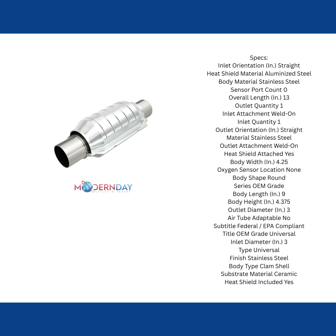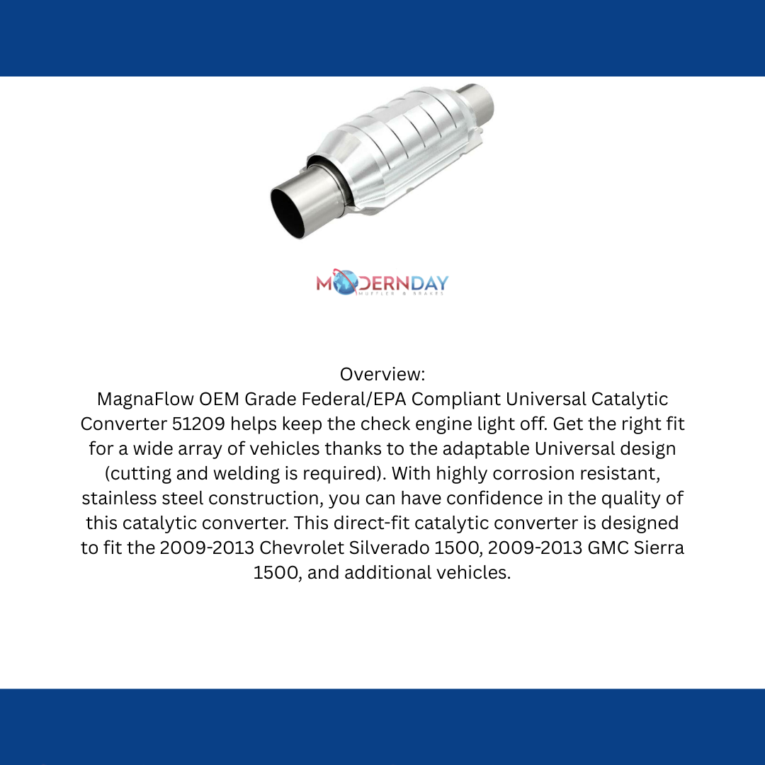 MagnaFlow OEM Grade Federal/EPA Compliant Universal Catalytic Converter 51209 helps keep the check engine light off. Get the right fit for a wide array of vehicles thanks to the adaptable Universal design (cutting and welding is required). With highly corrosion resistant, stainless steel construction, you can have confidence in the quality of this catalytic converter. This direct-fit catalytic converter is designed to fit the 2009-2013 Chevrolet Silverado 1500, 2009-2013 GMC Sierra 1500, and additional vehicles.