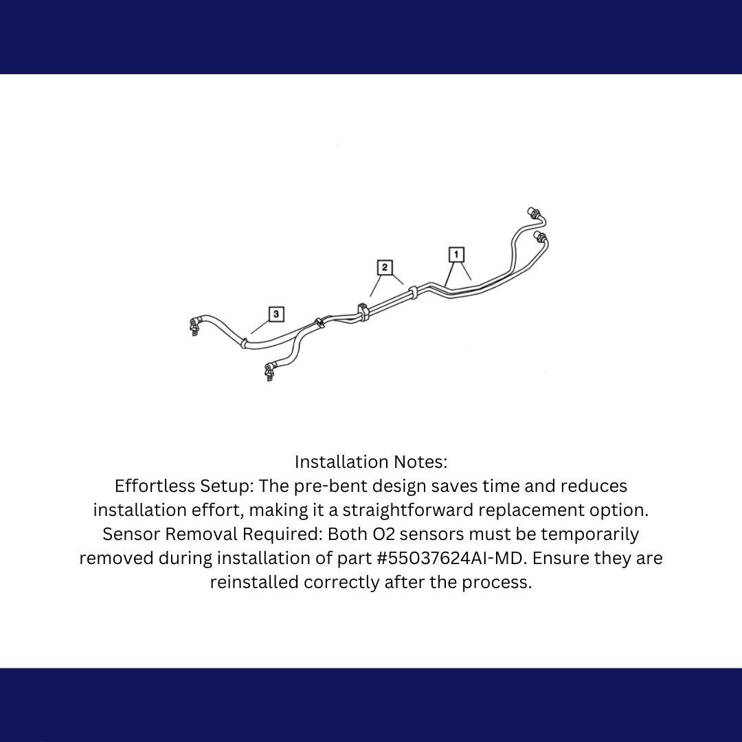 - Sensor Removal Required: Both O2 sensors must be temporarily removed during installation of part #55037624AI-MD. Ensure they are reinstalled correctly after the process.