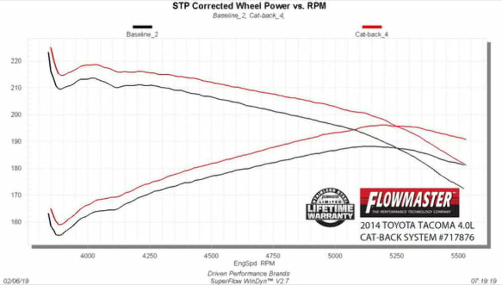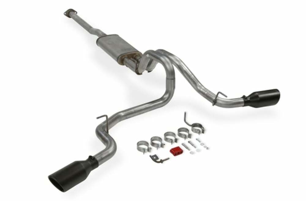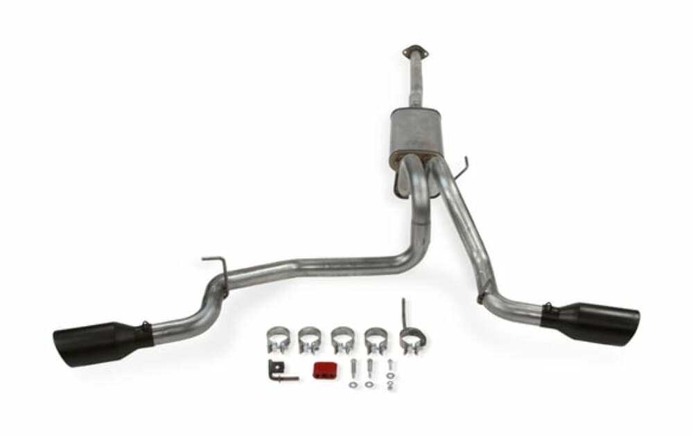 Our new Flowmaster® FlowFX® cat-back exhaust system for all 2005-2015 Toyota Tacoma trucks with the 4.0L engine is manufactured using durable 409 stainless steel tubing throughout and features a 2.50-inch inlet pipe leading to a FlowFX "straight-through" muffler for great sound and maximum performance. The dual 2.50-inch mandrel-bent tailpipes exit out the side at an angle behind the rear wheels directing exhaust away from your boat or travel trailer when towing. The system is finished off with a pair of large 4.50-inch diameter black ceramic coated 304S stainless steel tips, giving your truck a custom look that goes hand in hand with that deep performance FlowFX sound. This system uses all the existing factory hanger locations and includes an additional hanger to install the new left side tailpipe. Includes installation instructions and all necessary hardware for an easy installation that you can do at home.