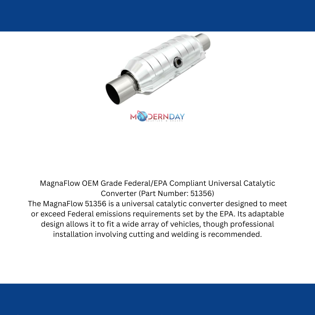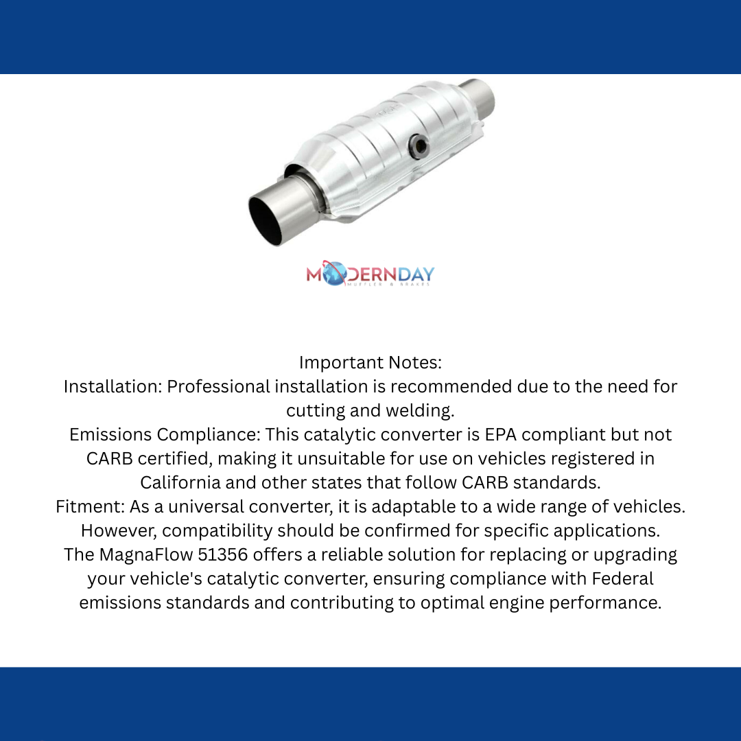 The MagnaFlow 51356 is a universal catalytic converter designed to meet or exceed Federal emissions requirements set by the EPA. Its adaptable design allows it to fit a wide array of vehicles, though professional installation involving cutting and welding is recommended.