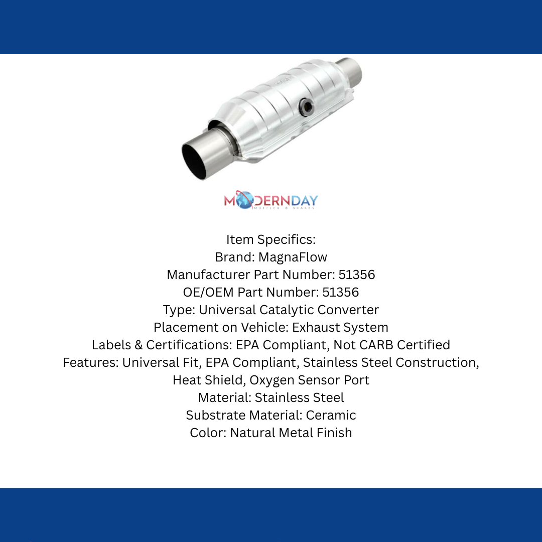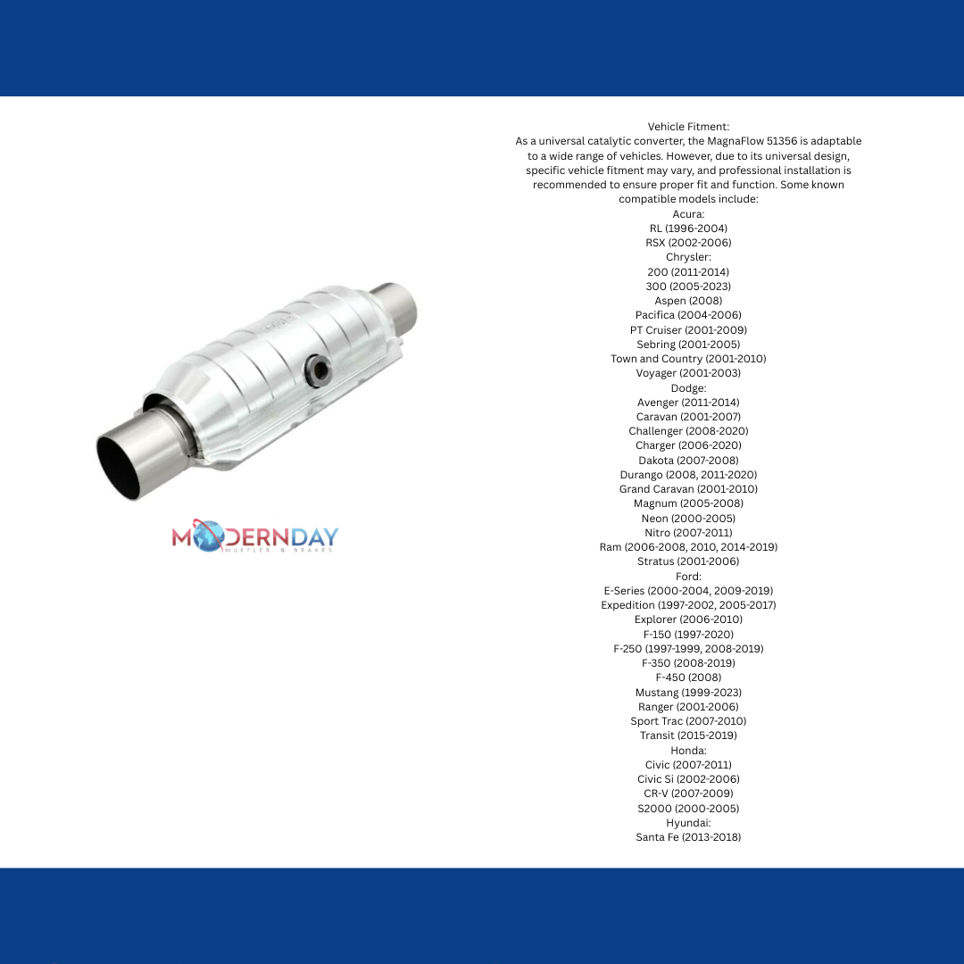 As a universal catalytic converter, the MagnaFlow 51356 is adaptable to a wide range of vehicles. However, due to its universal design, specific vehicle fitment may vary, and professional installation is recommended to ensure proper fit and function. Some known compatible models include: