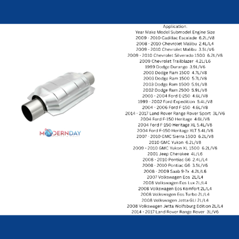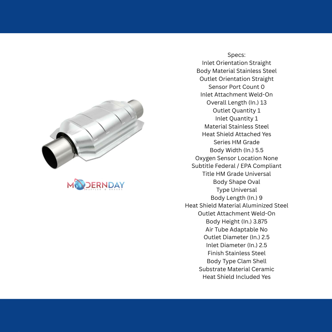 MagnaFlow HM Grade Federal/EPA Compliant Universal Catalytic Converter 99106HM helps keep the check engine light off. Get the right fit for a wide array of vehicles thanks to the adaptable Universal design (cutting and welding is required). With highly corrosion resistant, stainless steel construction, you can have confidence in the quality of this catalytic converter. This direct-fit catalytic converter is designed to fit the 2004-2006 Ford F-150, 2008-2010 Chevrolet Malibu, and additional vehicles.