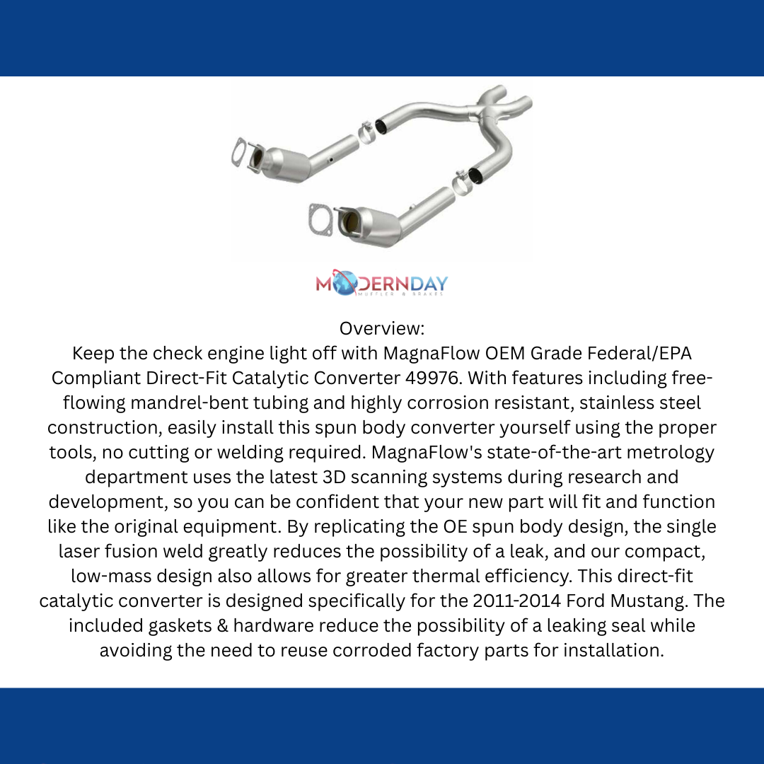 Keep the check engine light off with MagnaFlow OEM Grade Federal/EPA Compliant Direct-Fit Catalytic Converter 49976. With features including free-flowing mandrel-bent tubing and highly corrosion resistant, stainless steel construction, easily install this spun body converter yourself using the proper tools, no cutting or welding required. MagnaFlow's state-of-the-art metrology department uses the latest 3D scanning systems during research and development, so you can be confident that your new part will fit and function like the original equipment. By replicating the OE spun body design, the single laser fusion weld greatly reduces the possibility of a leak, and our compact, low-mass design also allows for greater thermal efficiency. This direct-fit catalytic converter is designed specifically for the 2011-2014 Ford Mustang. The included gaskets & hardware reduce the possibility of a leaking seal while avoiding the need to reuse corroded factory parts for installation.