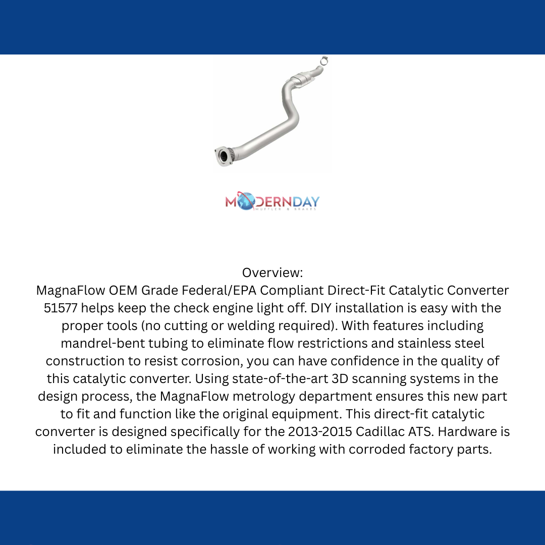 MagnaFlow OEM Grade Federal/EPA Compliant Direct-Fit Catalytic Converter 51577 helps keep the check engine light off. DIY installation is easy with the proper tools (no cutting or welding required). With features including mandrel-bent tubing to eliminate flow restrictions and stainless steel construction to resist corrosion, you can have confidence in the quality of this catalytic converter. Using state-of-the-art 3D scanning systems in the design process, the MagnaFlow metrology department ensures this new part to fit and function like the original equipment. This direct-fit catalytic converter is designed specifically for the 2013-2016 Cadillac ATS and interchanges with OE parts 23328468 and 22907426, among others. Hardware is included to eliminate the hassle of working with corroded factory parts. This replacement part is designed to meet or exceed Federal emissions requirements set forth by the EPA, complying with legal standards for OBDII Federally registered vehicles with California or Federal/EPA Emission systems.