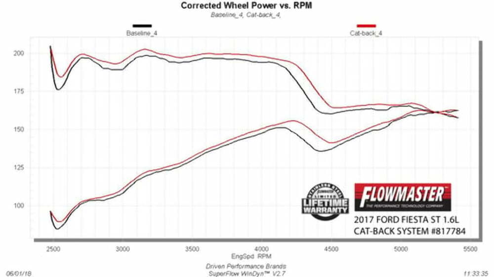 This Flowmaster American Thunder Cat-back exhaust system for the 2014-2019 Ford Fiesta ST with the 1.6L engine is perfect for the person looking for an aggressive exterior sound level with all of the performance benefits that you would expect from Flowmaster. System features include all 2.50-inch mandrel-bent stainless steel tubing, a specially designed matched set hi-flow performance muffler and resonator ensuring maximum power and a quality exterior sound with a moderate and pleasant interior tone at cruising speeds. The system uses all the factory hangers locations for an easy installation and is finished off with a highly polished dual 3.00-inch exhaust tip for both good looks and amazing sound. System includes all necessary parts, hardware and instructions for an installation you can do at home. Covered by our Lifetime Limited Warranty.