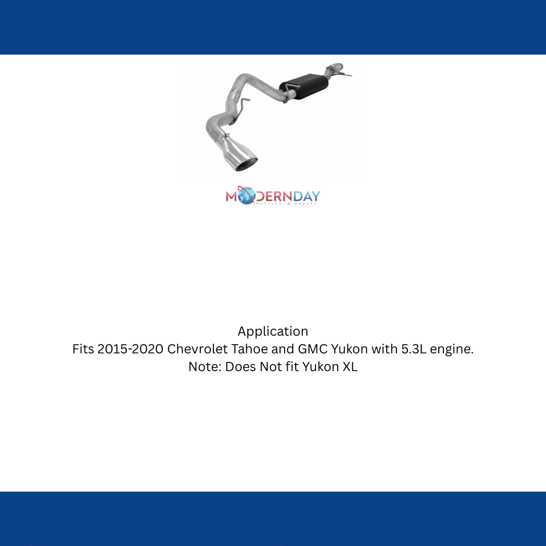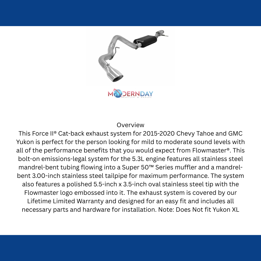 This Force II® Cat-back exhaust system for 2015-2020 Chevy Tahoe and GMC Yukon is perfect for the person looking for mild to moderate sound levels with all of the performance benefits that you would expect from Flowmaster®. This bolt-on emissions-legal system for the 5.3L engine features all stainless steel mandrel-bent tubing flowing into a Super 50™ Series muffler and a mandrel-bent 3.00-inch stainless steel tailpipe for maximum performance. The system also features a polished 5.5-inch x 3.5-inch oval stainless steel tip with the Flowmaster logo embossed into it. The exhaust system is covered by our Lifetime Limited Warranty and designed for an easy fit and includes all necessary parts and hardware for installation. Note: Does Not fit Yukon XL
