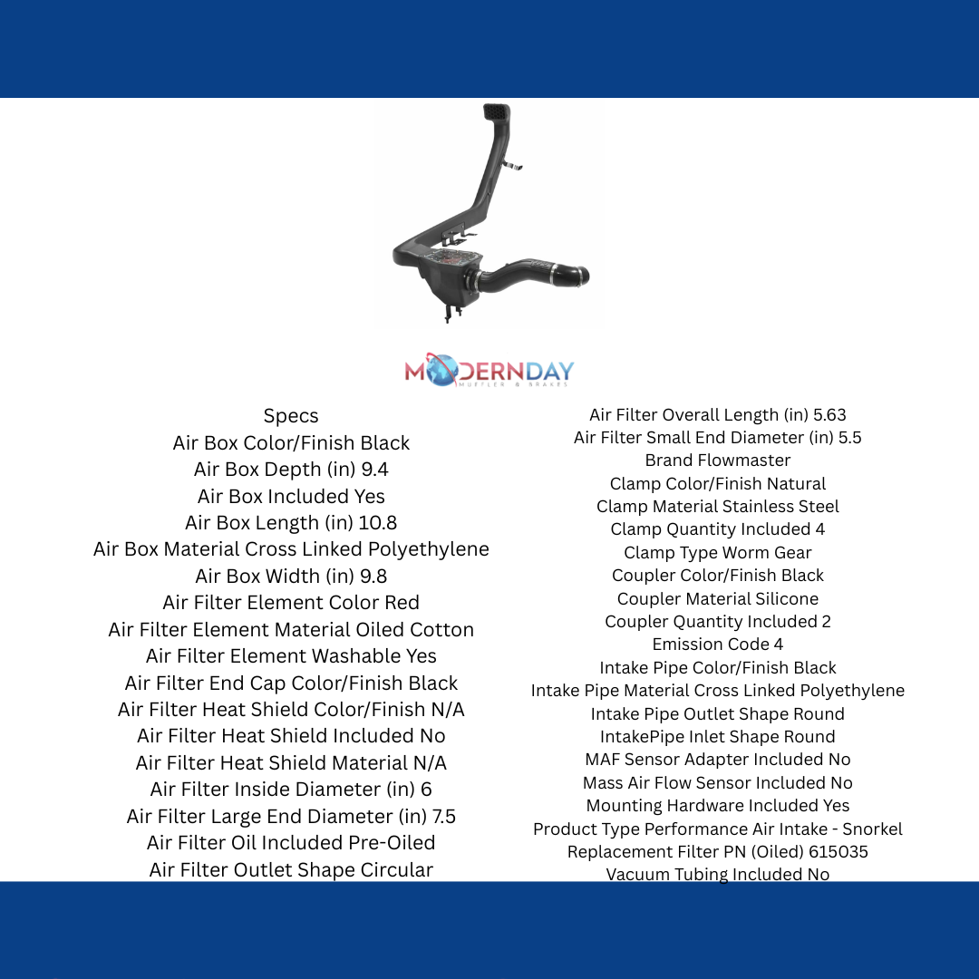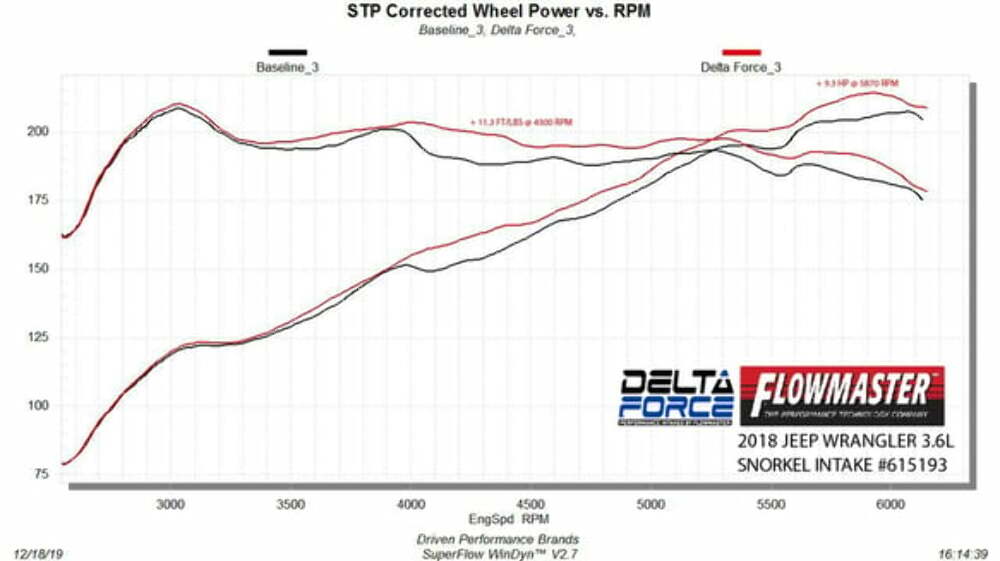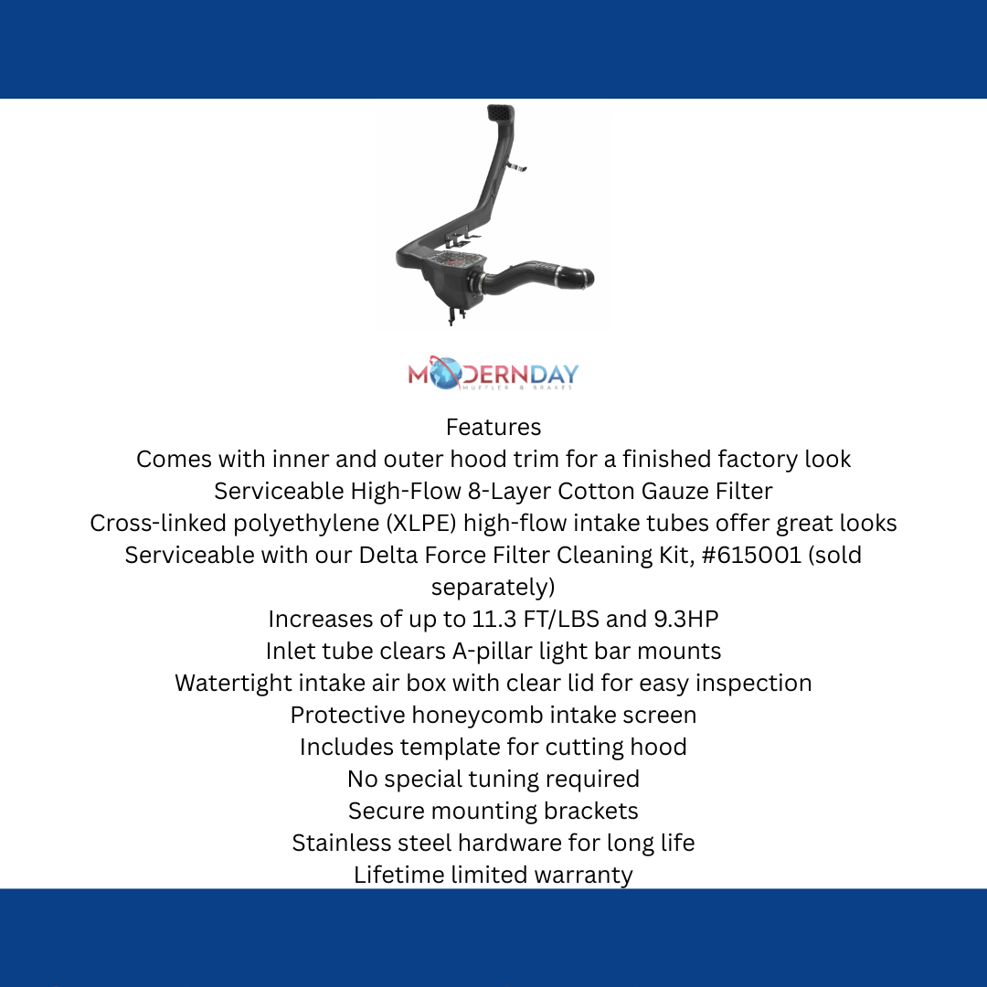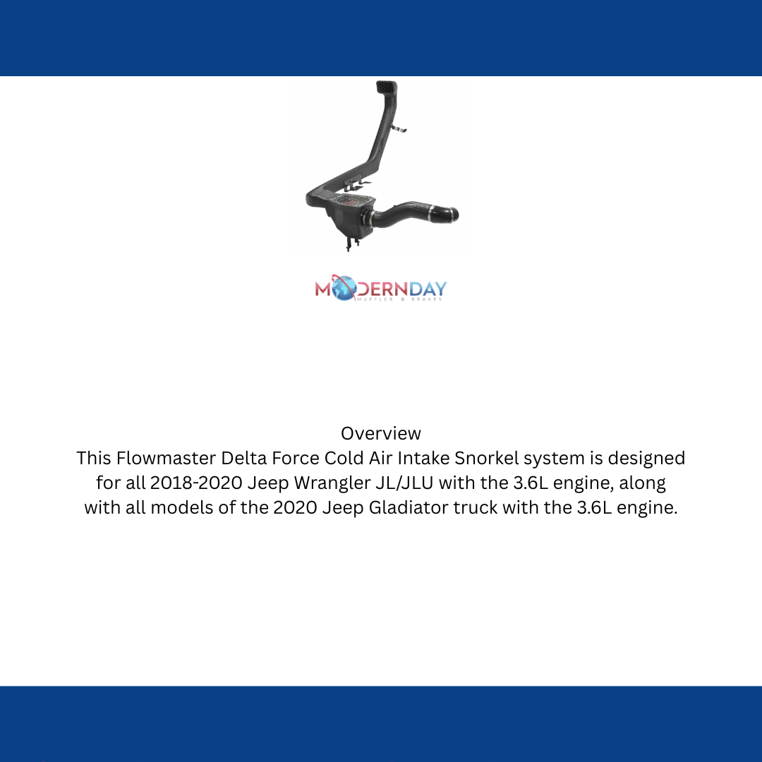 This Flowmaster Delta Force Cold Air Intake Snorkel system is designed for all 2018-2020 Jeep Wrangler JL/JLU with the 3.6L engine, along with all models of the 2020 Jeep Gladiator truck with the 3.6L engine. The Delta Force system comes with an ultra-t