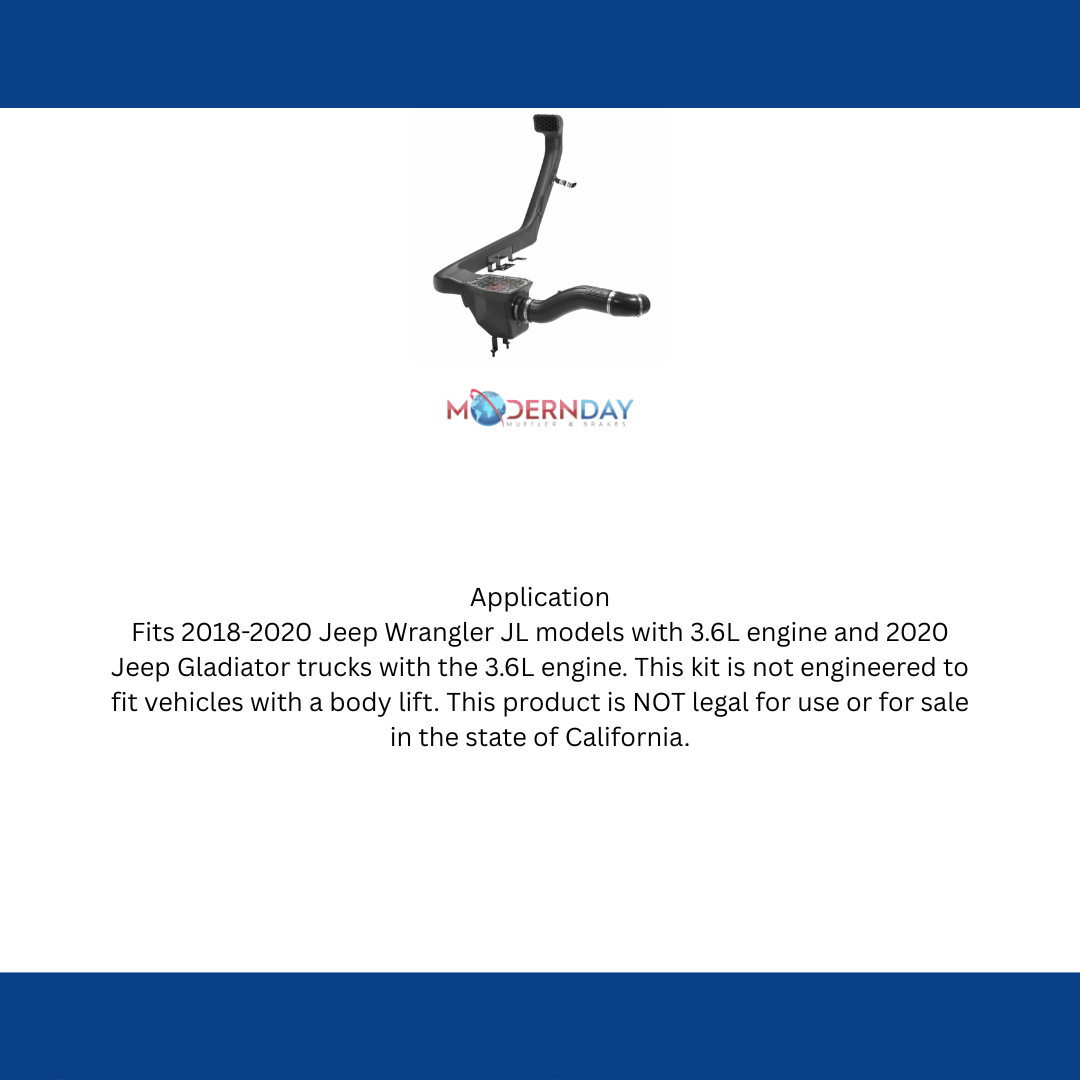 - Fits 2018-2020 Jeep Wrangler JL models with 3.6L engine and 2020 Jeep Gladiator trucks with the 3.6L engine. This kit is not engineered to fit vehicles with a body lift. This product is NOT legal for use or for sale in the state of California.