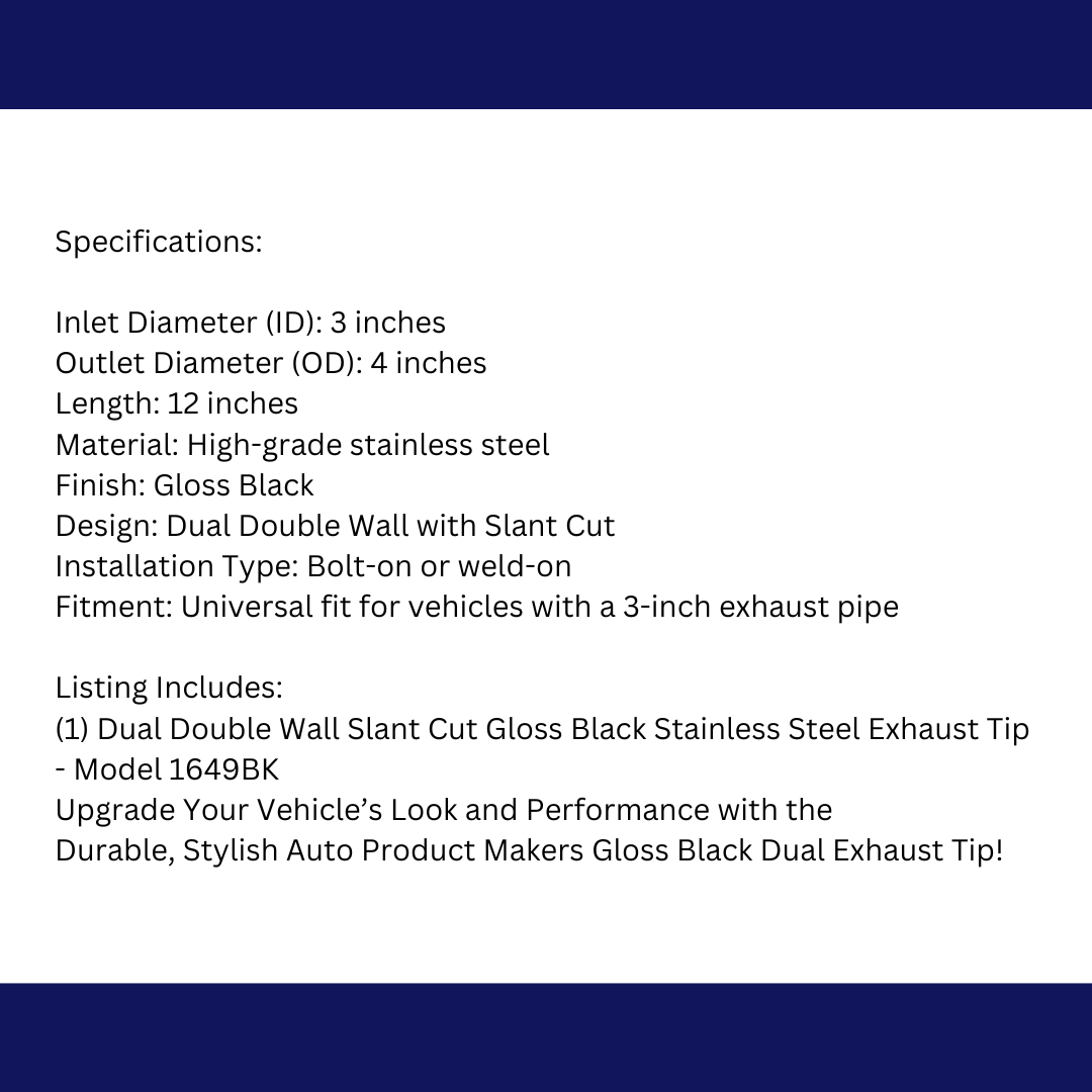 Enhance your vehicle’s style and performance with the Auto Product Makers 1649BK Dual Exhaust Tip. This premium 3-inch inlet, 4-inch outlet exhaust tip is designed with a dual double-wall, slant-cut style that adds a sleek and aggressive look to your vehicle. Crafted from high-quality stainless steel, it offers excellent durability and corrosion resistance. The gloss black finish provides a bold, modern appearance, while the double-wall construction ensures strength and heat resistance, reducing the chance of discoloration.