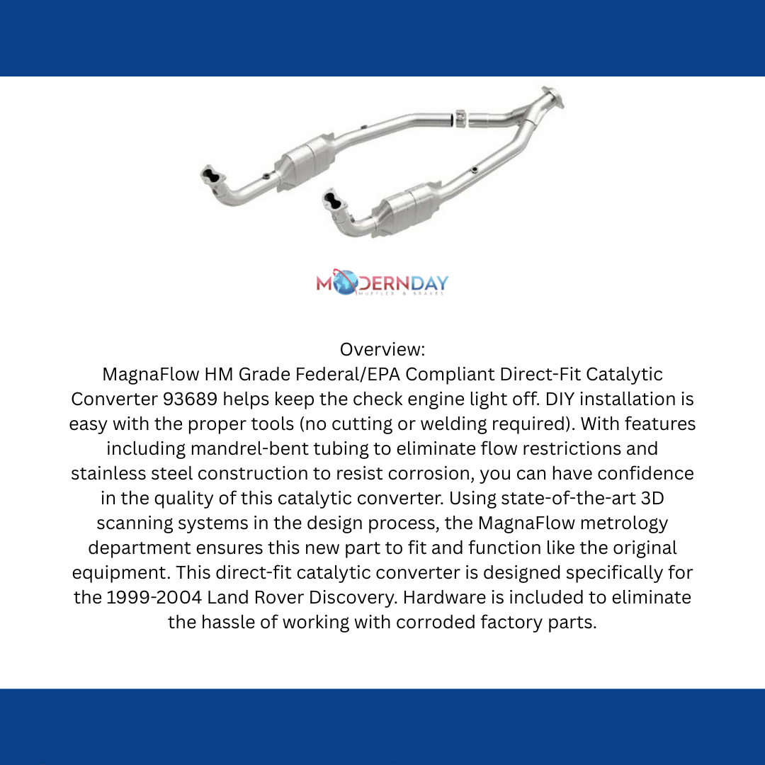 MagnaFlow HM Grade Federal/EPA Compliant Direct-Fit Catalytic Converter 93689 helps keep the check engine light off. DIY installation is easy with the proper tools (no cutting or welding required). With features including mandrel-bent tubing to eliminate flow restrictions and stainless steel construction to resist corrosion, you can have confidence in the quality of this catalytic converter. Using state-of-the-art 3D scanning systems in the design process, the MagnaFlow metrology department ensures this new part to fit and function like the original equipment. This direct-fit catalytic converter is designed specifically for the 1999-2004 Land Rover Discovery. Hardware is included to eliminate the hassle of working with corroded factory parts.