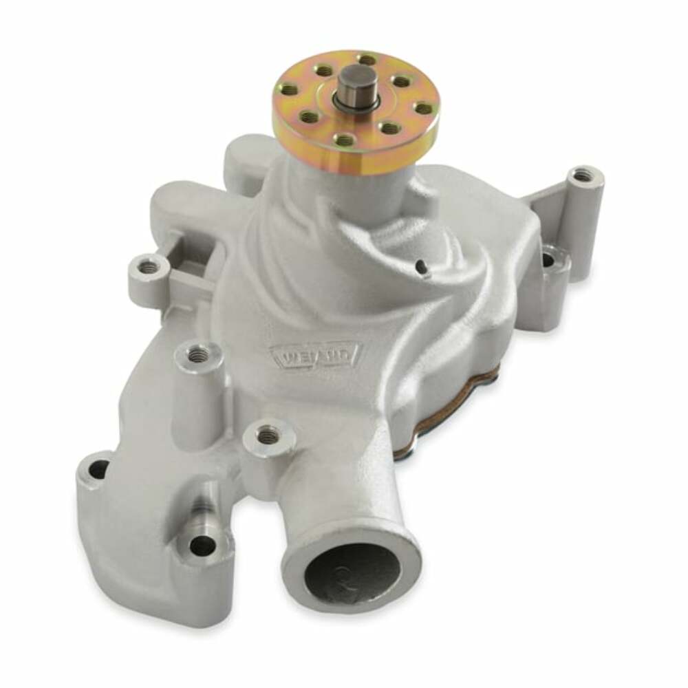 Weiand''s light weight, performance aluminum mechanical Action-Plus water pumps give a weight saving of 30% to 50% over stock cast-iron pumps. These pumps have been completely redesigned for better performance and utilize our exclusive "twisted snout" look and feature a premium quality bearing and seal that have twice the load capacity of stock pumps. Weiand''s exclusive housing counterbore keeps the bearing form "walking" out. All pumps are designed with the necessary bracket bosses and water connections to fit popular street applications.