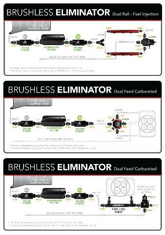 The market leader in fuel delivery systems and components, Aeromotive introduces its first brushless fuel pump series. The same Eliminator Fuel Pump the world has come to trust and depend on, now available with the latest brushless-motor technology. Built for up to 65 psi of sustained pressure, featuring our bedrock solid, dual chamber roller vane design that primes easily, reduces friction and improves efficiency. ORB-12 inlet and ORB-10 outlet ports. For EFI applications use regulator P/N 13305 or P/N 13134. For carbureted applications use regulator P/N 13202 or P/N 13212. 25% more flow at pressure than our A1000 Brushless Fuel Pump. Perfect for ?blow-through? carbureted engines up to 1,700 FWHP. Brushless motors employ sensors to monitor rotor angle to provide faster and more reliable phase shifting, producing more torque capacity and motor efficiency. Instead of the armature rotating, in a brushless motor the magnets rotate around the armature and the motor controller manages the phase shift to keep the motor rotating under load (load is related to pressure in a fuel pump).? With more torque per watt and a higher torque to weight ratio, brushless motors produce lower noise and deliver higher reliability. With a higher level of efficiency, down to fractions of a second in design speed control, the new Aeromotive brushless fuel pumps provide precise control of fuel pump RPM as pressure rises, better maintaining pump RPM and flow, producing a flatter flow curve.? Tight tolerances result in less current draw, less heat and extended life. Now there is the ability to upgrade to a premium brushless pump for faster, more reliable and uninterrupted fuel delivery with less power consumption and potential for wear or failure.