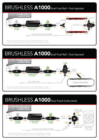 The market leader in fuel delivery systems and components, Aeromotive introduces its first brushless fuel pump series. The same A1000 Fuel Pump the world has come to trust and depend on, now available with the latest brushless-motor technology. Built for up to 65 psi of sustained pressure, featuring our bedrock solid roller vane design that primes easily, reduces friction and improves efficiency. ORB-10 inlet and outlet ports. For EFI applications use regulator P/N 13303 or P/N 13139. For carbureted applications use regulator P/N 13204 or P/N 13304. Perfect for ?blow-through? carbureted engines up to 1200 FWHP. Brushless motors employ sensors to monitor rotor angle to provide faster and more reliable phase shifting, producing more torque capacity and motor efficiency. Instead of the armature rotating, in a brushless motor the magnets rotate around the armature and the motor controller manages the phase shift to keep the motor rotating under load (load is related to pressure in a fuel pump).? With more torque per watt and a higher torque to weight ratio, brushless motors produce lower noise and deliver higher reliability. With a higher level of efficiency, down to fractions of a second in design speed control, the new Aeromotive brushless fuel pumps provide precise control of fuel pump RPM as pressure rises, better maintaining pump RPM and flow, producing a flatter flow curve.? Tight tolerances result in less current draw, less heat and extended life. Now there is the ability to upgrade to a premium brushless pump for faster, more reliable and uninterrupted fuel delivery with less power consumption and potential for wear or failure.