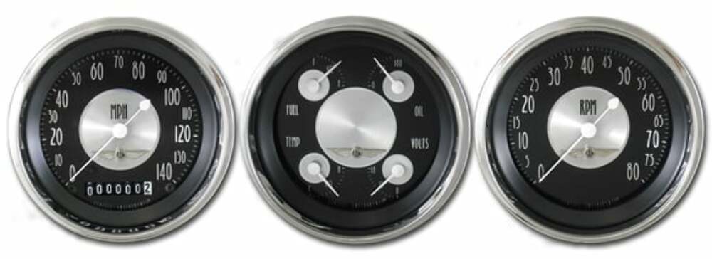 All American Tradition 3 3/8" Speedo, Quad, & Tach with Stainless High Step Bezel Curved Glass Lens