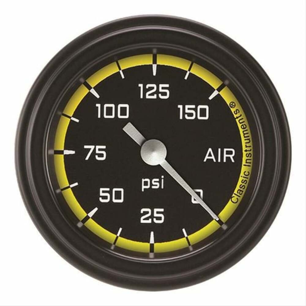 AutoCross Yellow 2 1/8" Full sweep Air Pressure gauge, 150psi, with standard matte-black low step bezel and flat glass lens