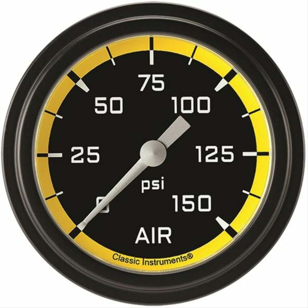 AutoCross Yellow 2 5/8" Full sweep Air Pressure gauge, 150psi, with standard matte-black low step bezel and flat glass lens
